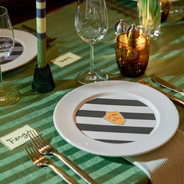 A striped spectacle put smiles on everyone’s faces at Saturday night’s pajama party. Cocktail, late night and die-cut dinner menus, seating cards and custom wrapping paper that covered gifts for the guests incorporated Jordan’s favorite perky pattern and coordinated with the décor.