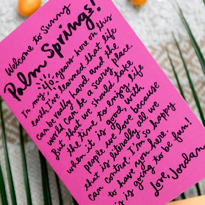 Jordan Ferney, founder of Color Factory and Oh Happy Day, feted her 40th with an unforgettable destination birthday bash with all of her besties. Working closely with planner Ashley Smith Events, we designed the distinctive visual vibe of the weekend, from an incomparable interactive invitation to singular day-of items that made three days of partying in Palm Springs extra special and especially memorable.