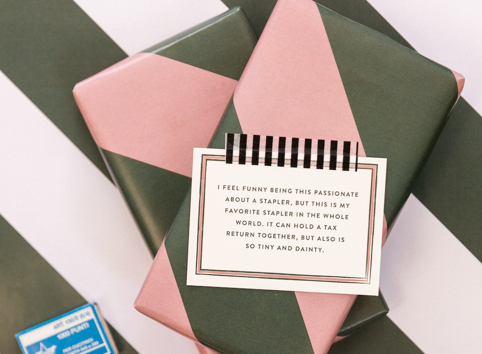The invitation needed to be as creative and colorful as the birthday girl, which meant a hand-painted pink-and-white-striped mailer, an accordion fold format, whimsical calligraphy, a sunny yellow custom crest and a sheet of stickers stored in a vellum envelope! Guests could dress the sketch of Jordan (courtesy of her husband Paul) in her birthday suit with the stickers that modeled the suggested attire for the weekend – Jordan actually wore the bubblegum pink and blue gown that inspired the card’s cover and one of the stickers!