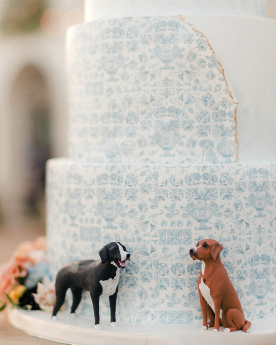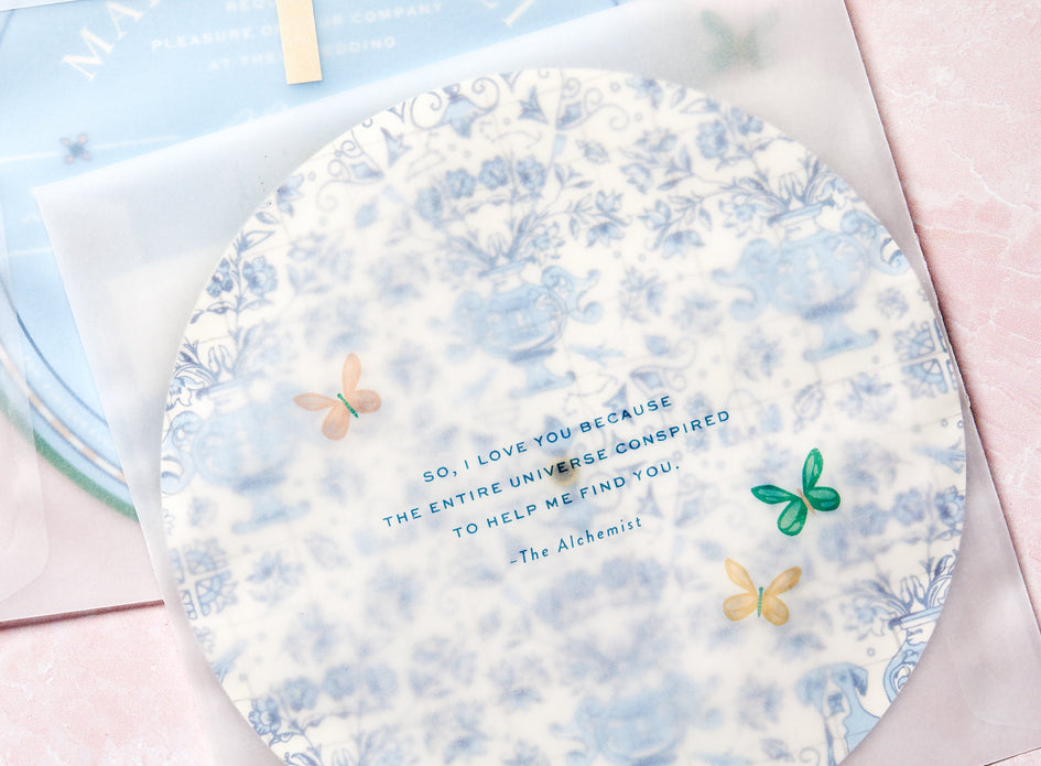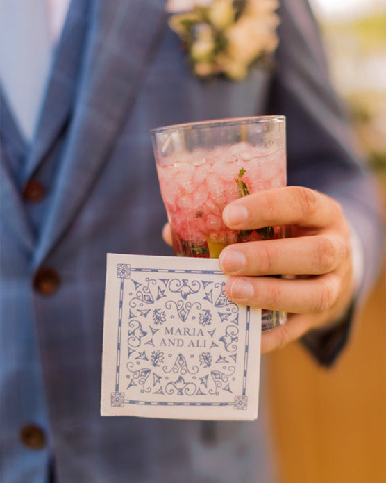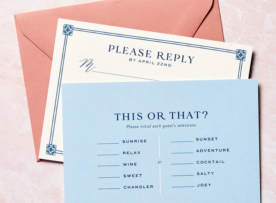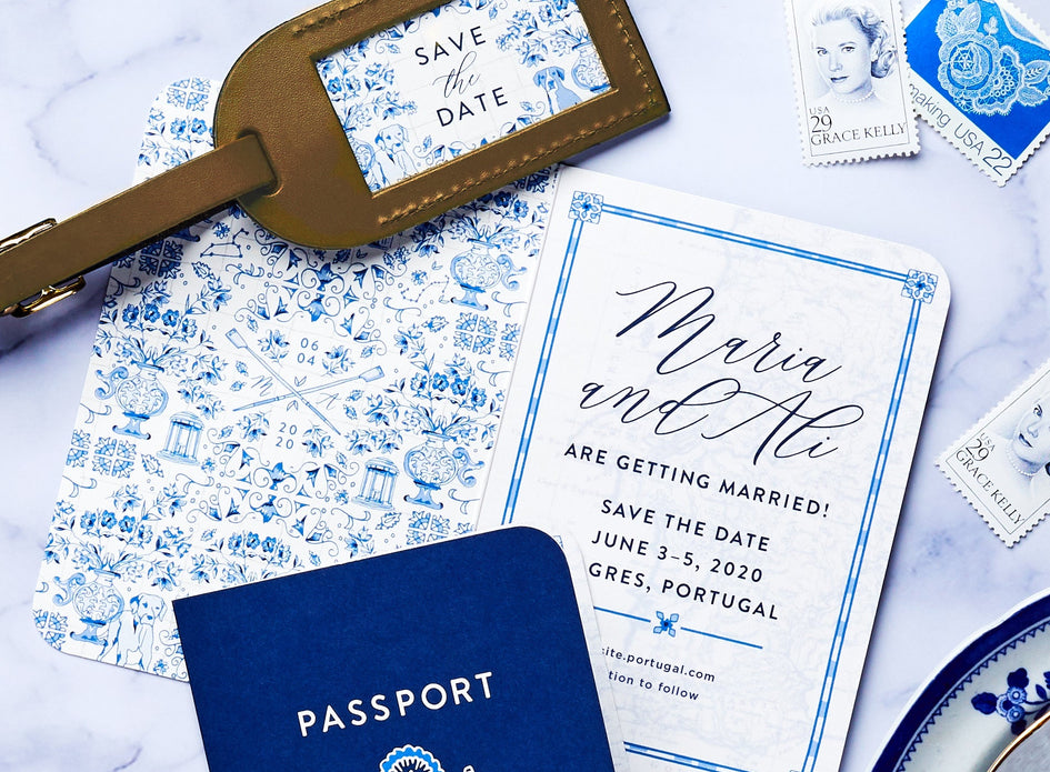 A passport-style save the date was just the ticket to announce Ali and Maria’s upcoming Portuguese wedding. A personalized blue-and-white tile pattern inspired by the host country’s iconic ceramic artistry was replete with symbols significant to the couple– St. Louis and University of North Carolina landmarks, airplanes, pups, rowing paddles and more. Accompanied by a brown leather luggage tag, this first impression was both fun and functional.
