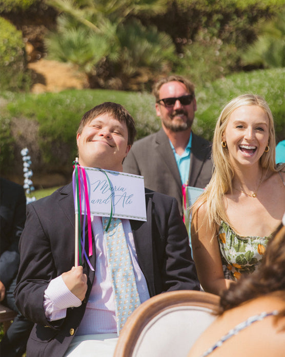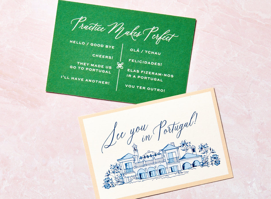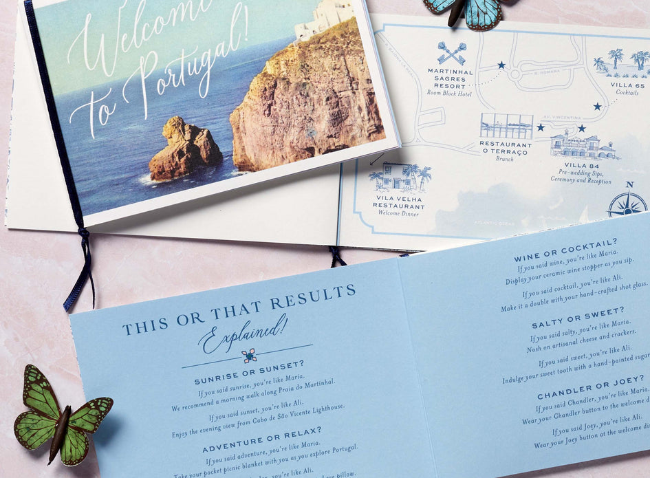 The whimsical, interactive and individualized elements continued in the formal wedding invitation. An inner vellum envelope embellished with butterflies and a favorite quote held a die-cut dial that spun to reveal the weekend’s schedule. A petite postcard provided a hand-illustrated snapshot of the ceremony venue – Ali’s family home – and encouraged attendees to practice important Portuguese phrases, such as “Cheers” and “I’ll have another.” Even the reply set had an extra level of engagement. A lighting round of This or That, which corresponded with Ali and Maria’s respective personalities, served as a mini Myers-Briggs test that helped build anticipation and tailor an ideal itinerary for each guest. All was revealed in the welcome note.