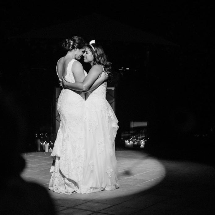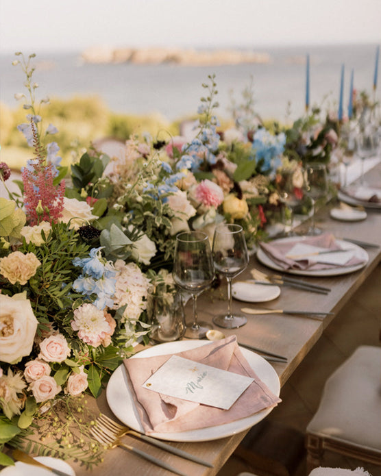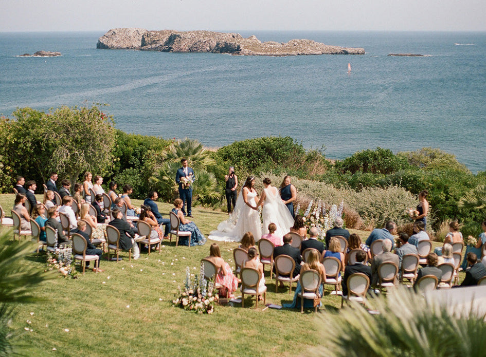 After a yearlong delay, the big day finally arrived! Kraft welcome boxes tagged with travel stickers and a collection of colorful program banners with ribbons awaited guests. The thoughtful touches were almost as breathtaking as the deep “something blue” sea that backdropped the brides.