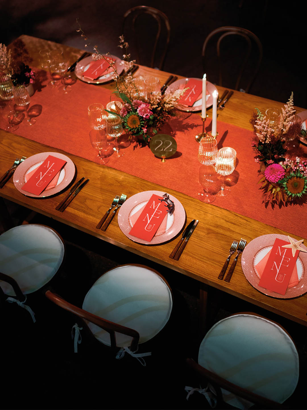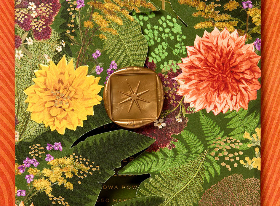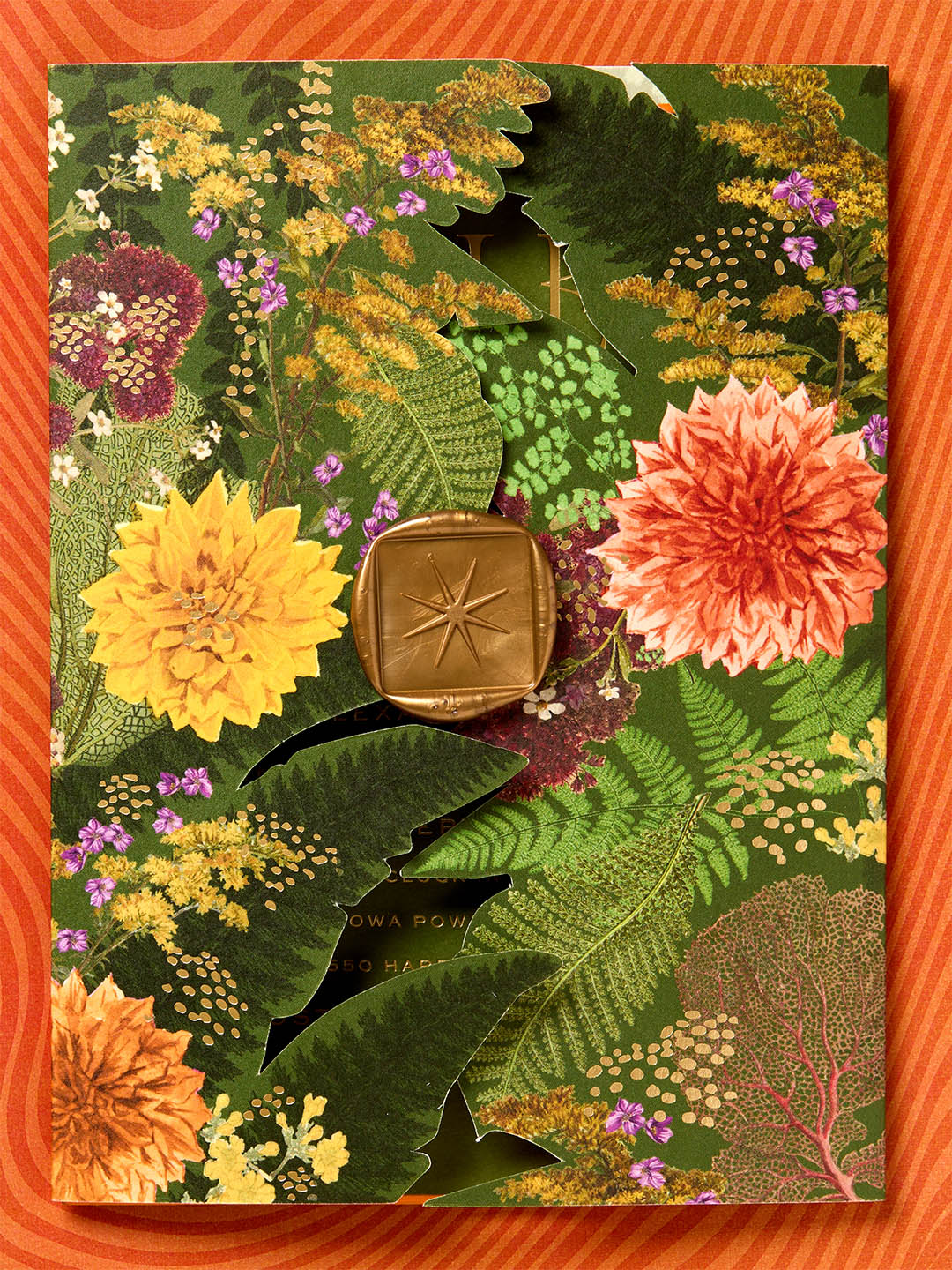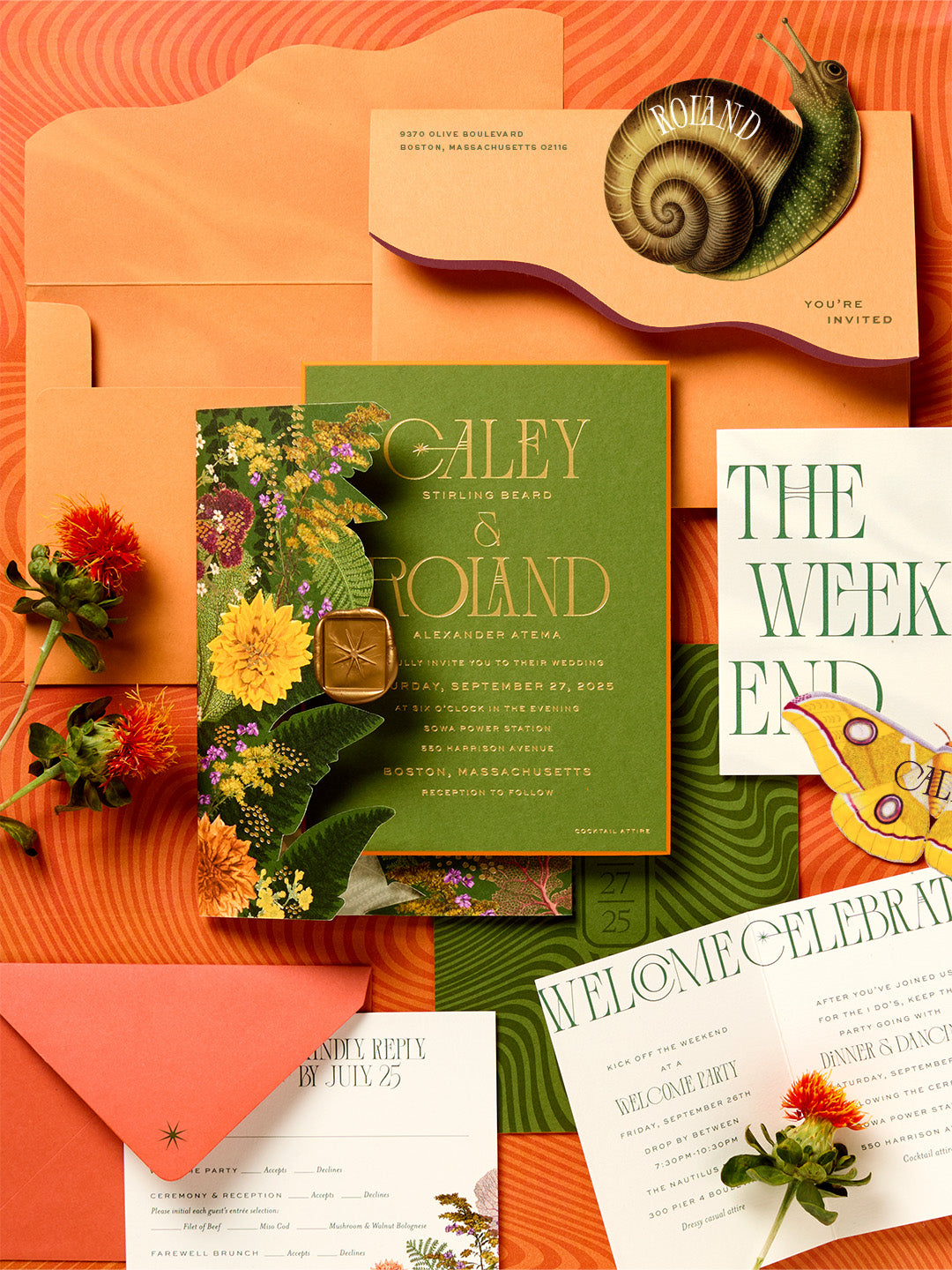 A cool orange envelope piqued instant intrigue. But the die-cut wrap featuring an iteration of our collage pattern with exaggerated blooms segued into an even more suspenseful presentation moment – the invitation unveiling. With C+R’s names oversized, stylized, and stamped in gold foil for good measure, we ensured the main invitation wasn’t overshadowed by the surrounding graphics.