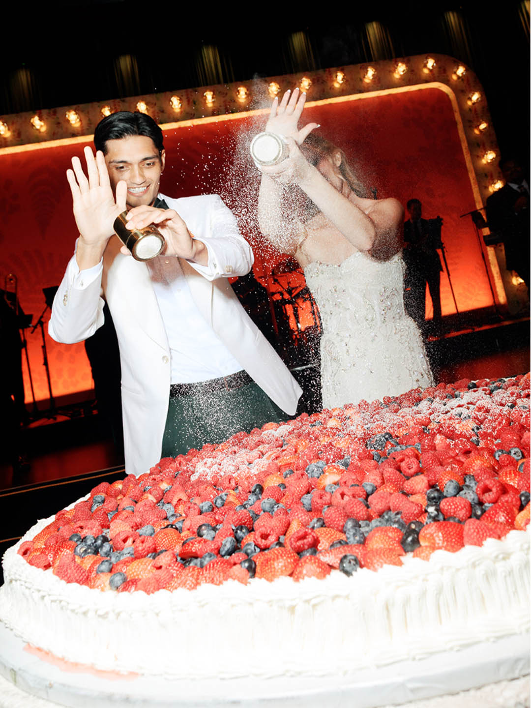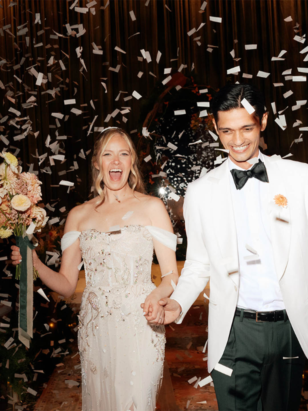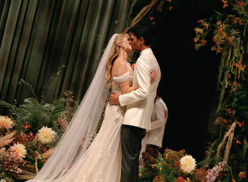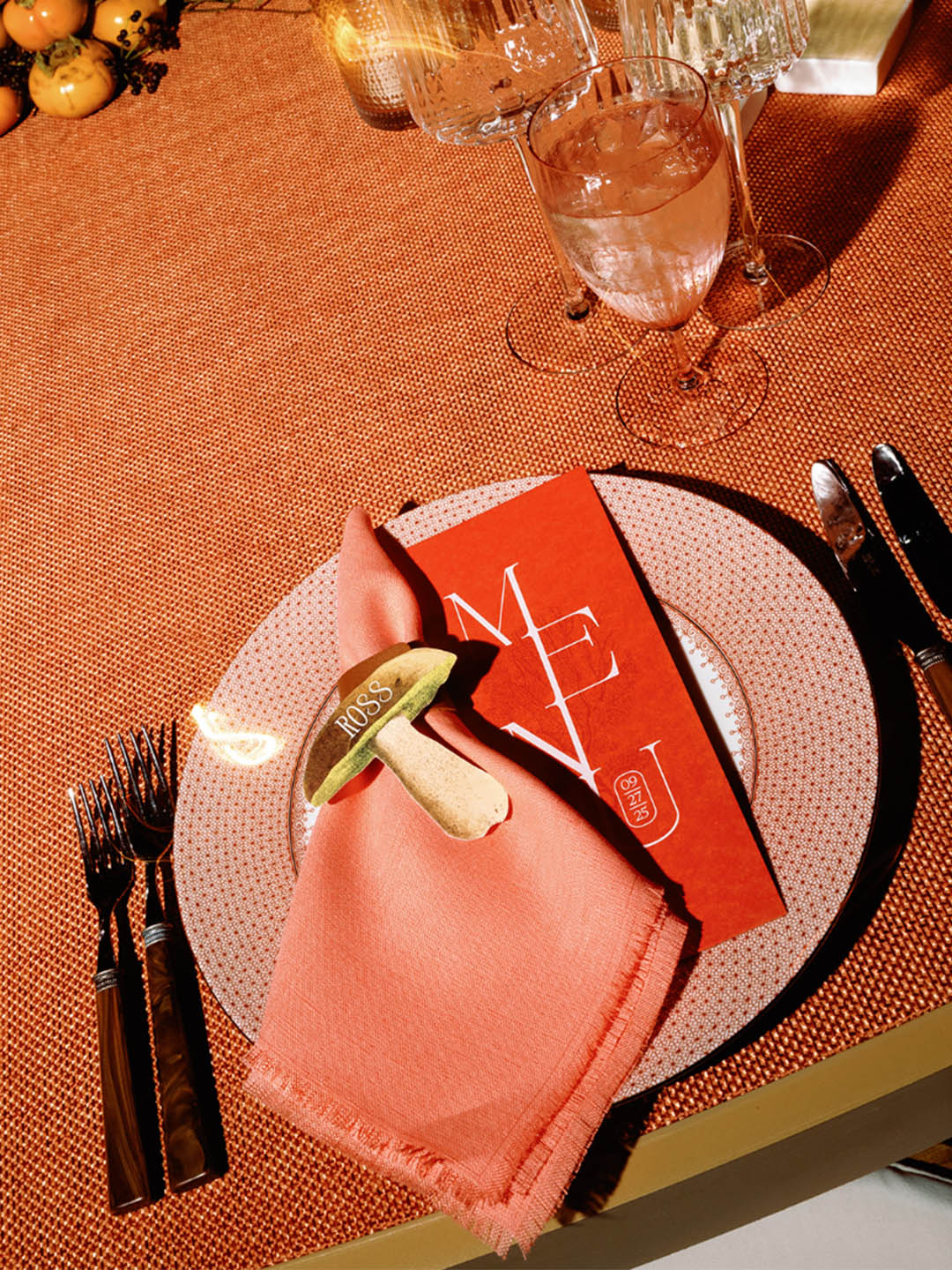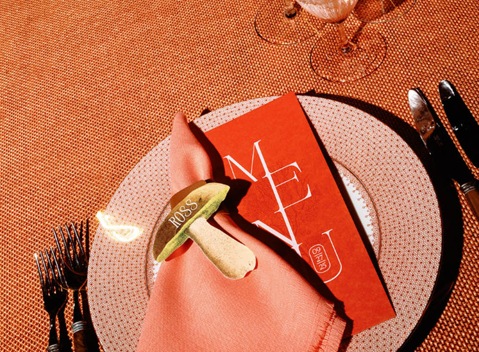A cool orange envelope piqued instant intrigue. But the die-cut wrap featuring an iteration of our collage pattern with exaggerated blooms segued into an even more suspenseful presentation moment – the invitation unveiling. With C+R’s names oversized, stylized, and stamped in gold foil for good measure, we ensured the main invitation wasn’t overshadowed by the surrounding graphics.