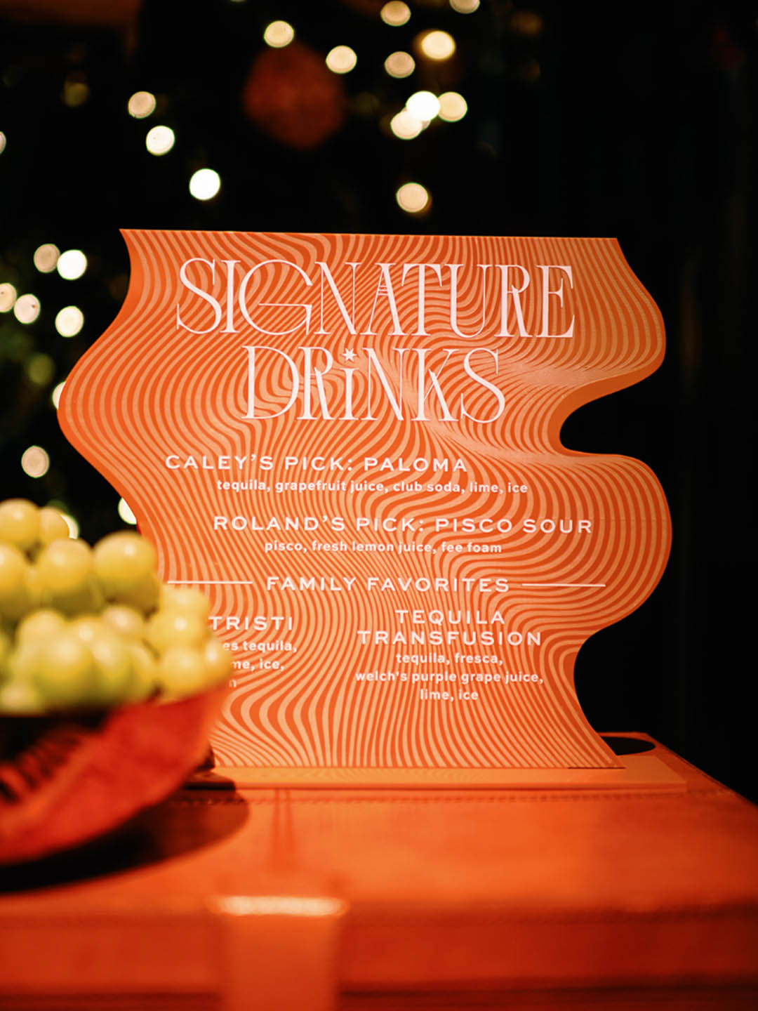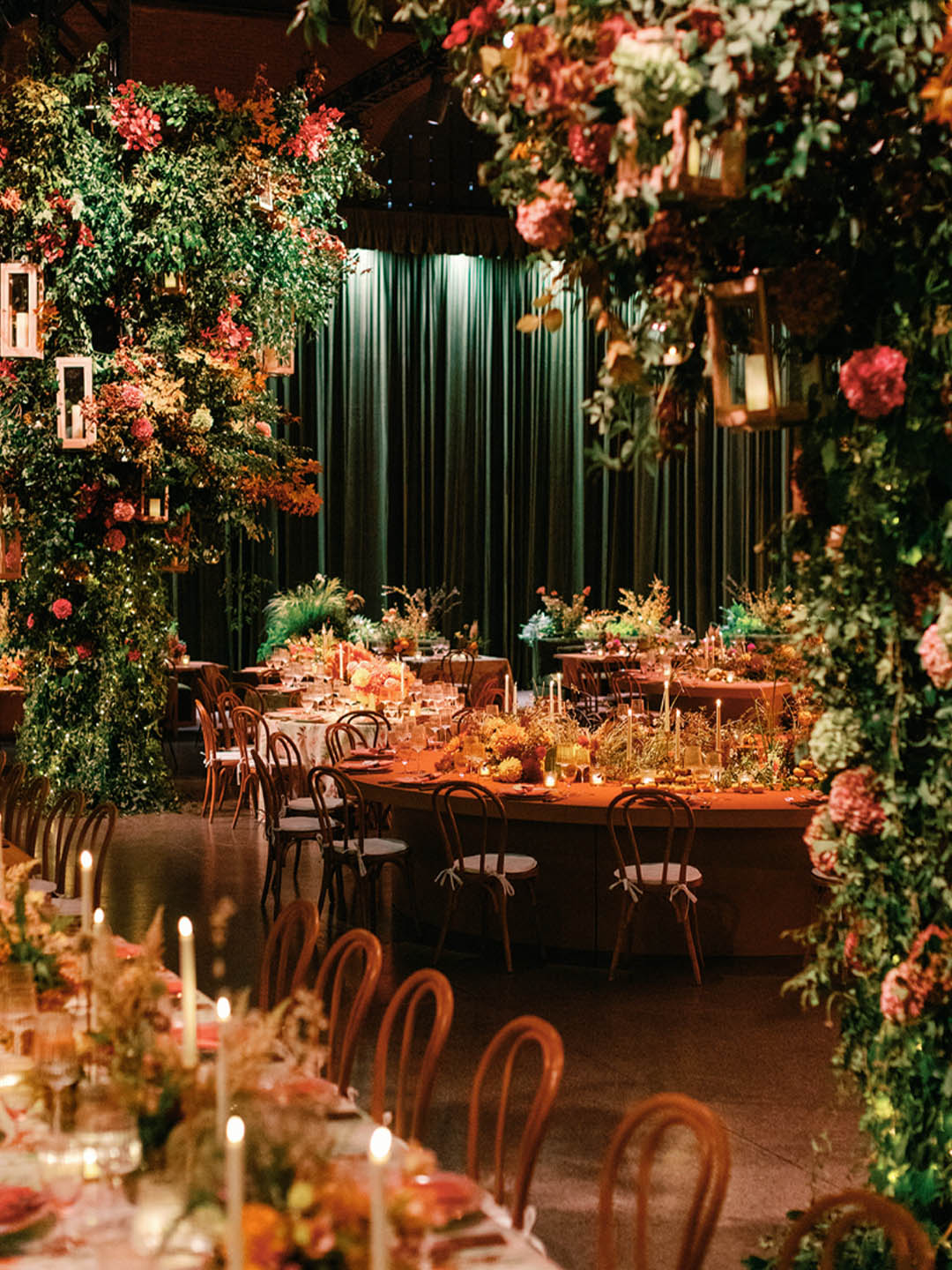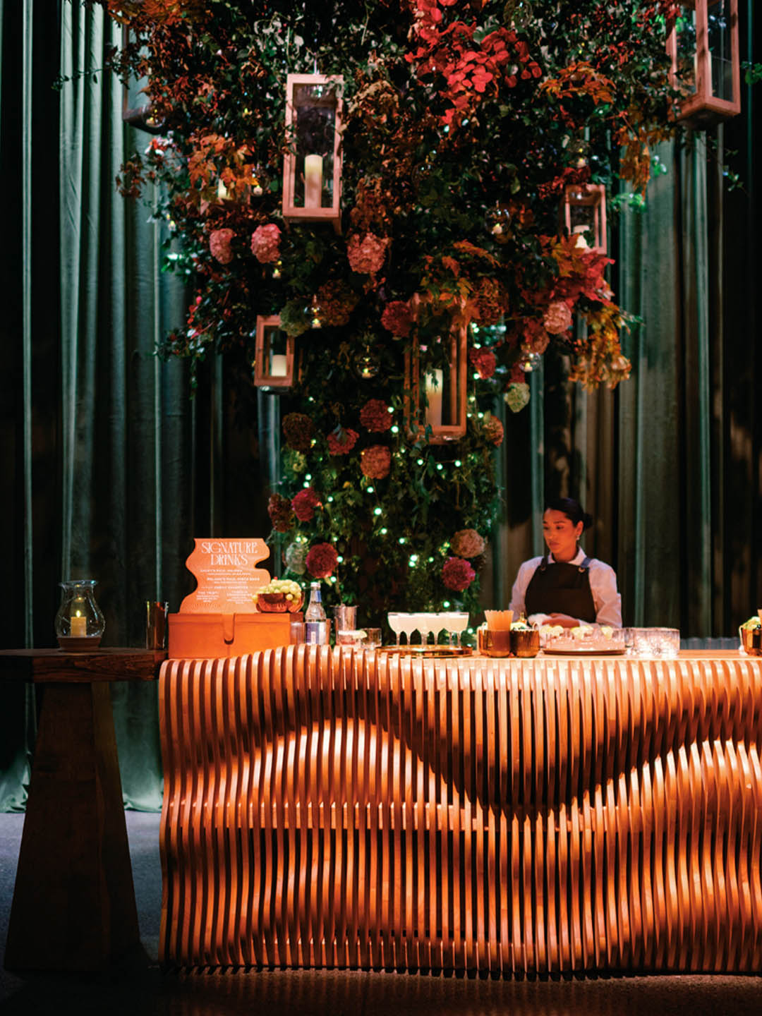 Like an immersive art installation, the cavernous SoWa Power Station transformed into a fairytale fever dream. Lanterns dotted towering, twinkling floral displays that looked as though they sprouted from the cement floor, while our living things place cards dwelled within the tablescape. From the waviness of the branding to the bar façade to the cocktail signage to the table layout, every aspect of this event ecosystem felt intentional and harmonious.