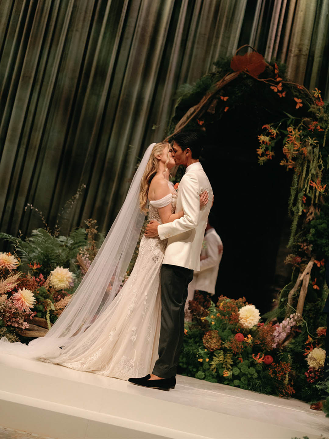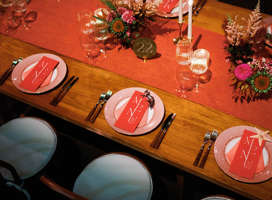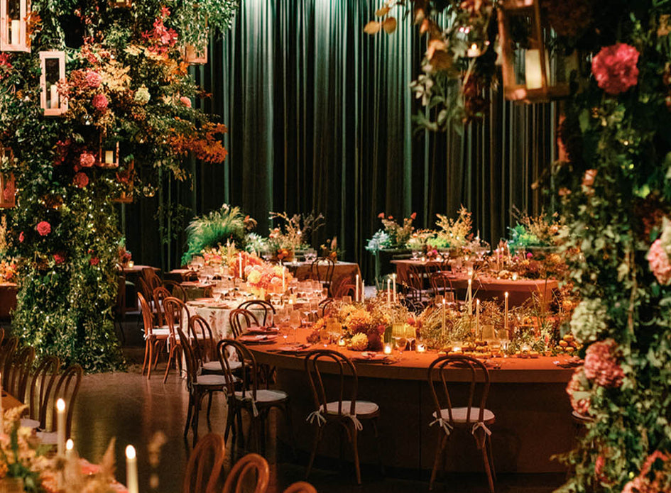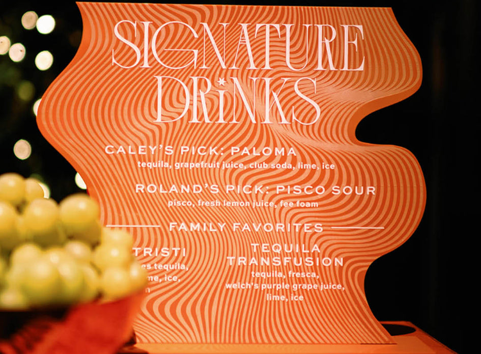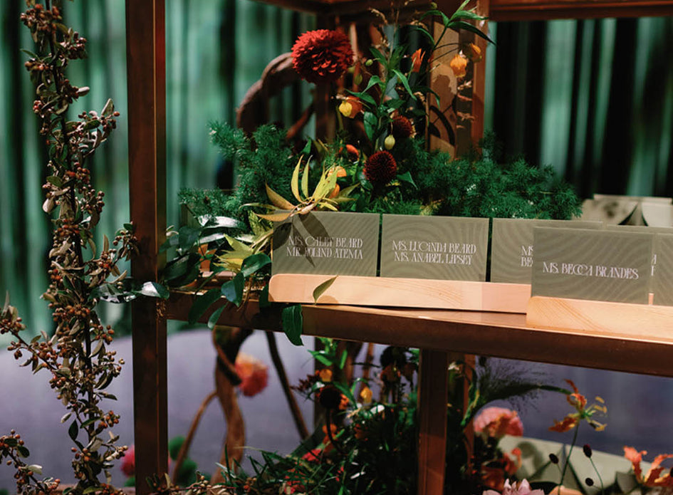 Like an immersive art installation, the cavernous SoWa Power Station transformed into a fairytale fever dream. Lanterns dotted towering, twinkling floral displays that looked as though they sprouted from the cement floor, while our living things place cards dwelled within the tablescape. From the waviness of the branding to the bar façade to the cocktail signage to the table layout, every aspect of this event ecosystem felt intentional and harmonious.