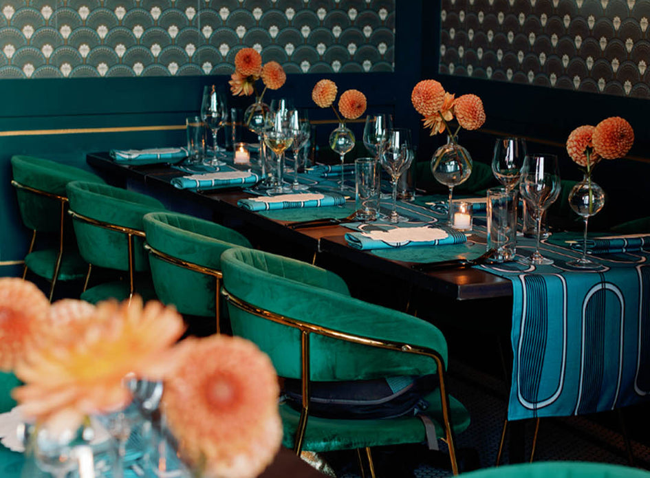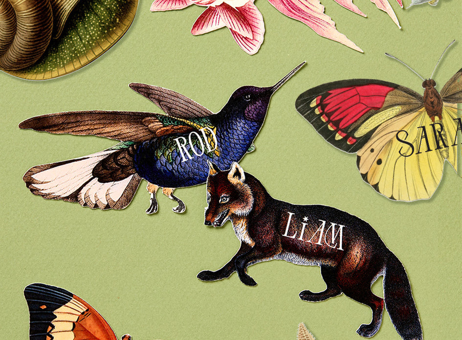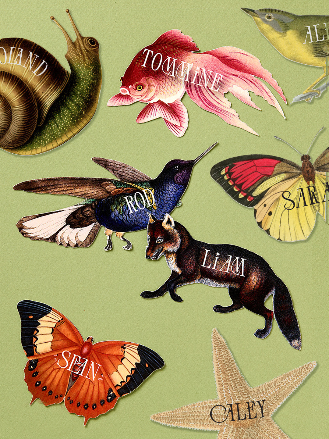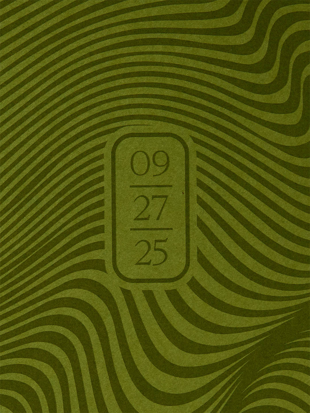 Our branding for Caley and Roland relied on a striking contemporary typeface, a saturated pre-fall color palette grounded in sage and mossy greens and an overall sinuosity of form. While no monogram or mark was present, the visual identity was no less personalized. By camouflaging imagery symbolic to the couple into the collage patterning, we enhanced the event’s underlying air of mystique.