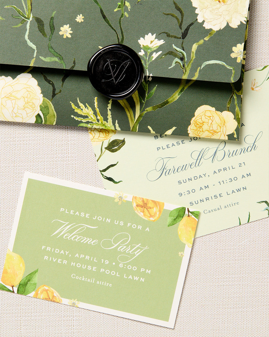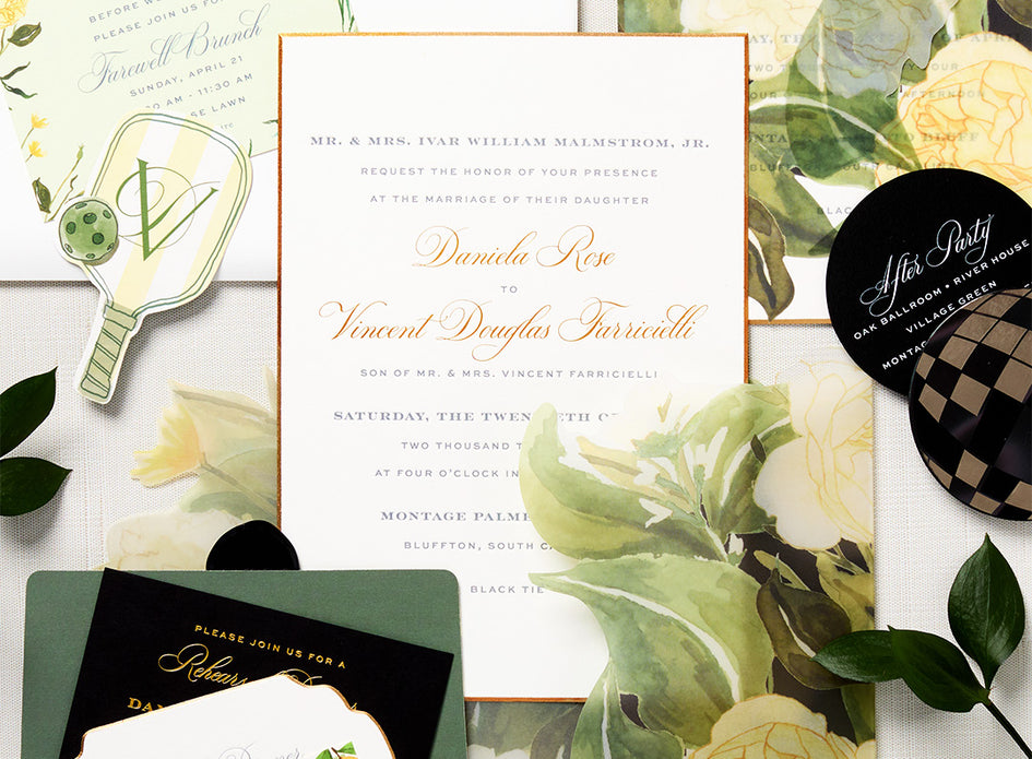 For Daniela and Vincent, a chance meeting on vacation ended in “I do” at Montage Palmetto Bluff, the primary inspiration behind their visual identity from Cheree Berry Paper & Design. We molded their wedding stationery to feel like an organic extension of the destination by grounding it in a coastal-formal color palette and native Lowcountry flora and fauna. But with added infusions of Italian elegance and youthful exuberance plus varying textures, watercolor styles and branding marks, we turned up the Southern charm.