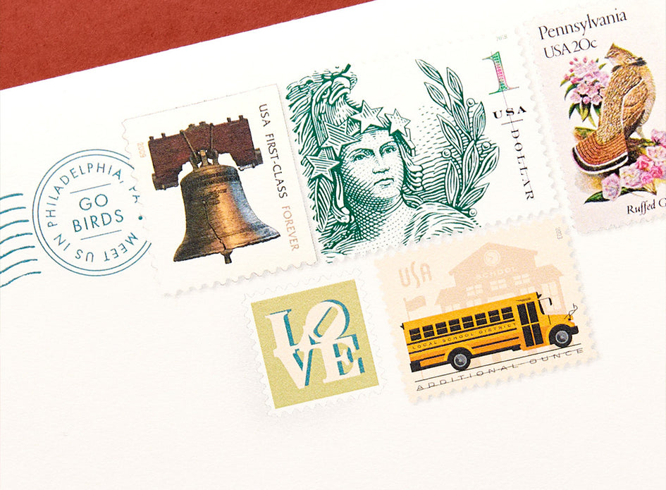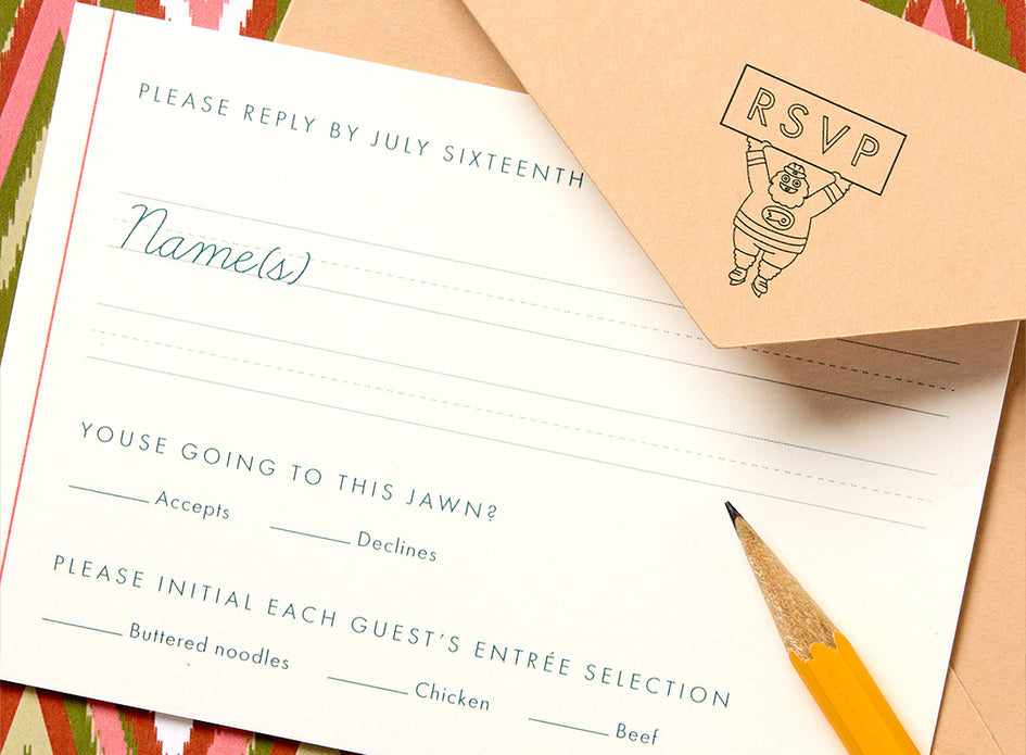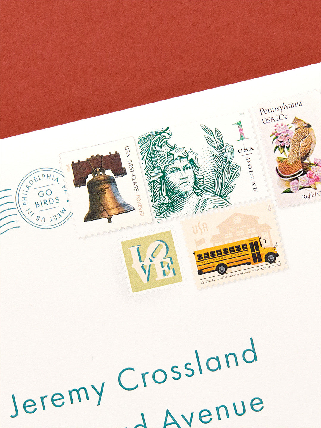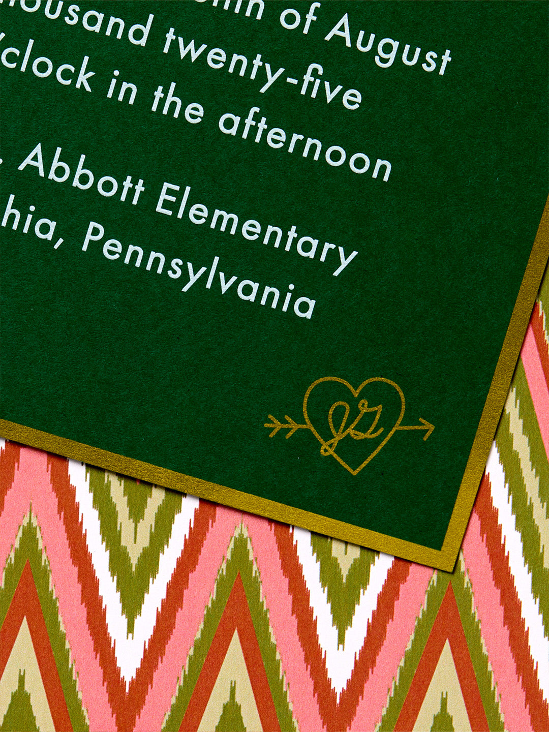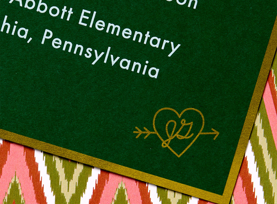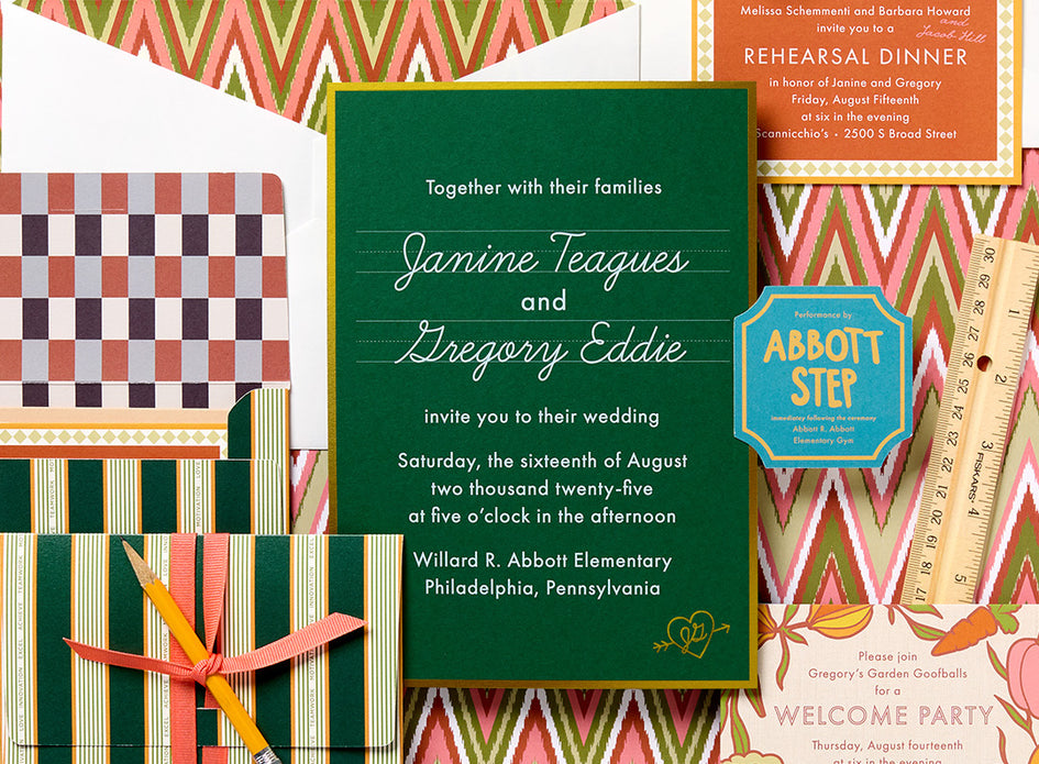 To celebrate the City of Brotherly Love, I wrote Philly slang into the RSVP responses, gave a shout out to the beloved mascot Gritty, selected symbolic postage and set the rehearsal dinner at the local date night hotspot. Familiar elementary school imagery – ruled paper, a mini pencil embellishment, the bus traveling along the border of the envelope – was strategically placed but subtle so as not to feel too youthful. Altogether, these layered details create a wedding invitation suite that is both whimsical and deeply rooted in the world of Abbott Elementary.