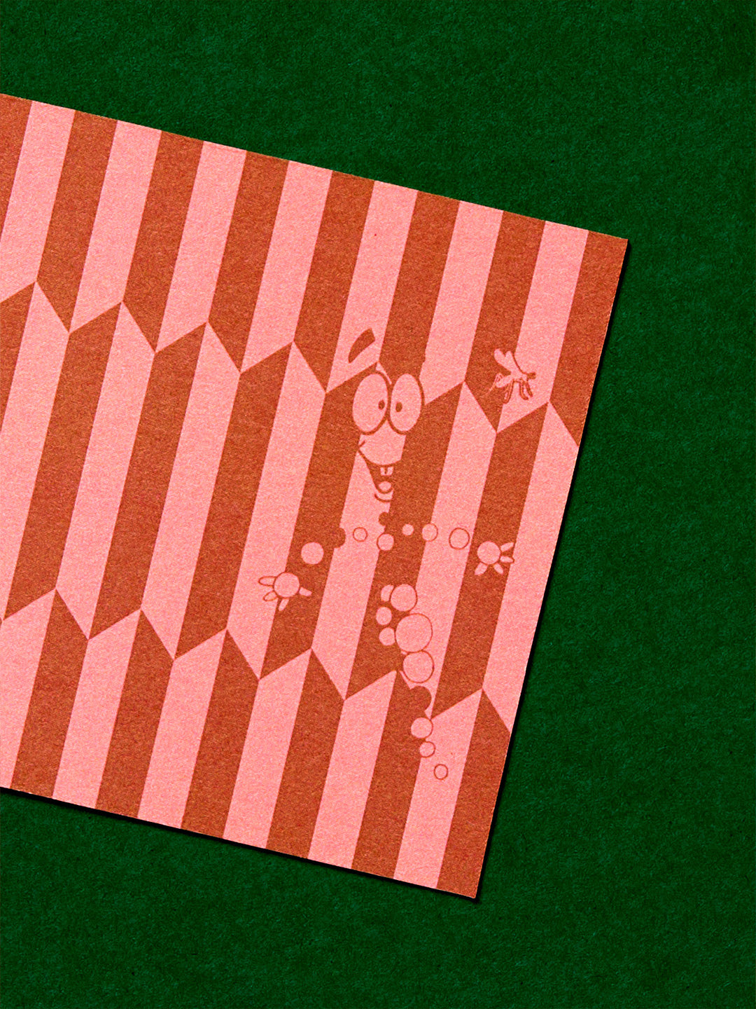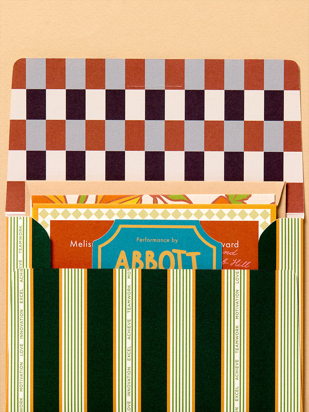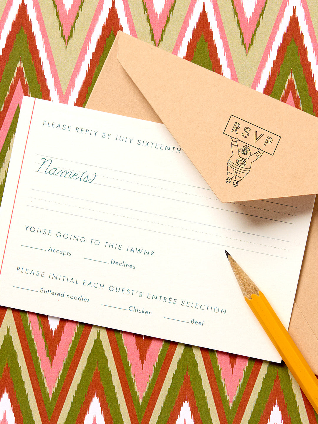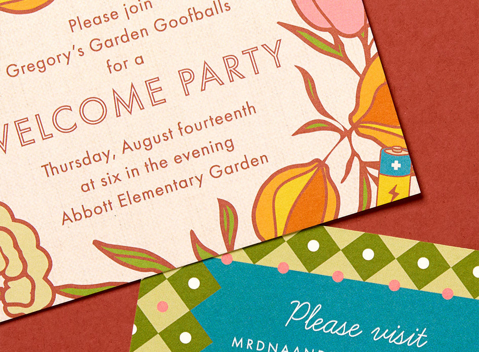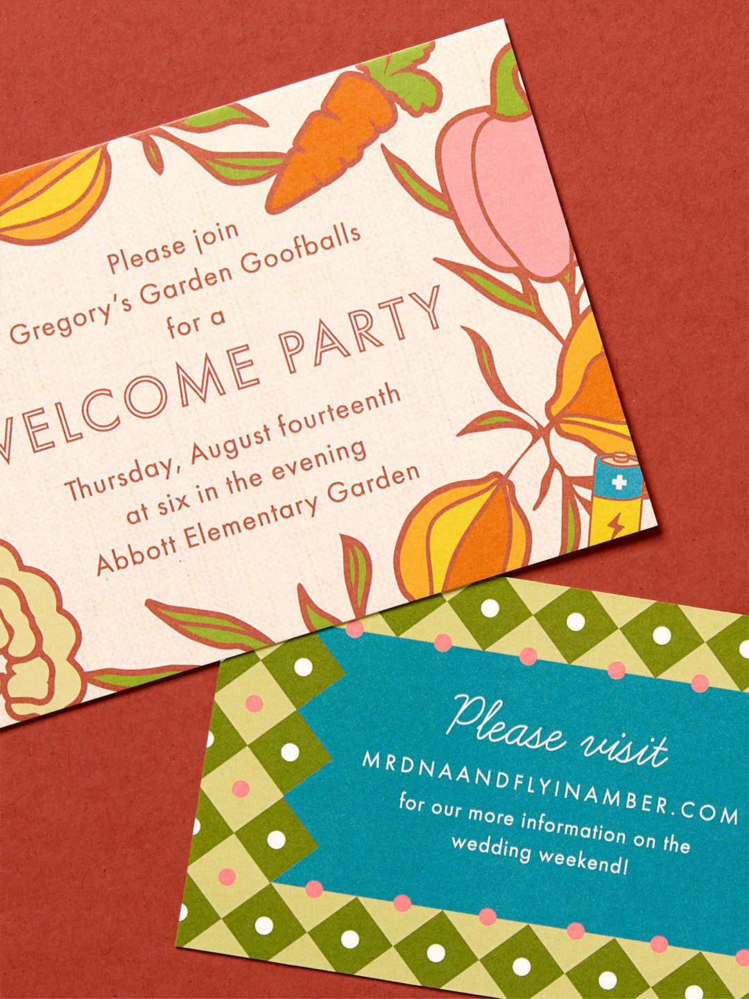 Janine’s statement wardrobe prompted the lively pattern play carried across the suite. But episode easter eggs are hidden throughout, from the It’s Always Sunny energy tucked into the welcome party card to the iconic couple’s costume camouflaged on the website card to the motivational mural moment on the interior envelope. And it wouldn’t be Gregory’s wedding without the Garden Goofballs and some buttered noodles!