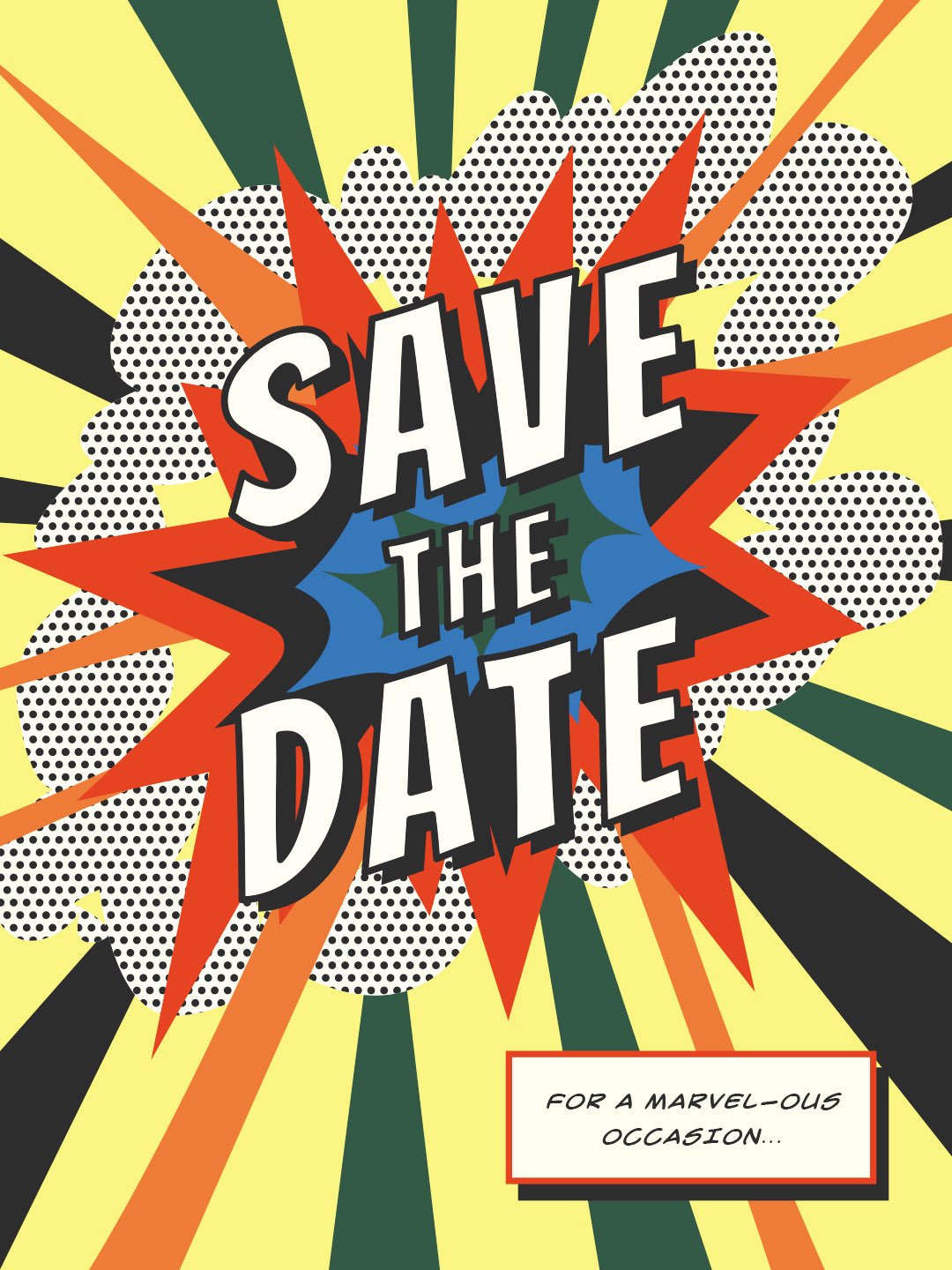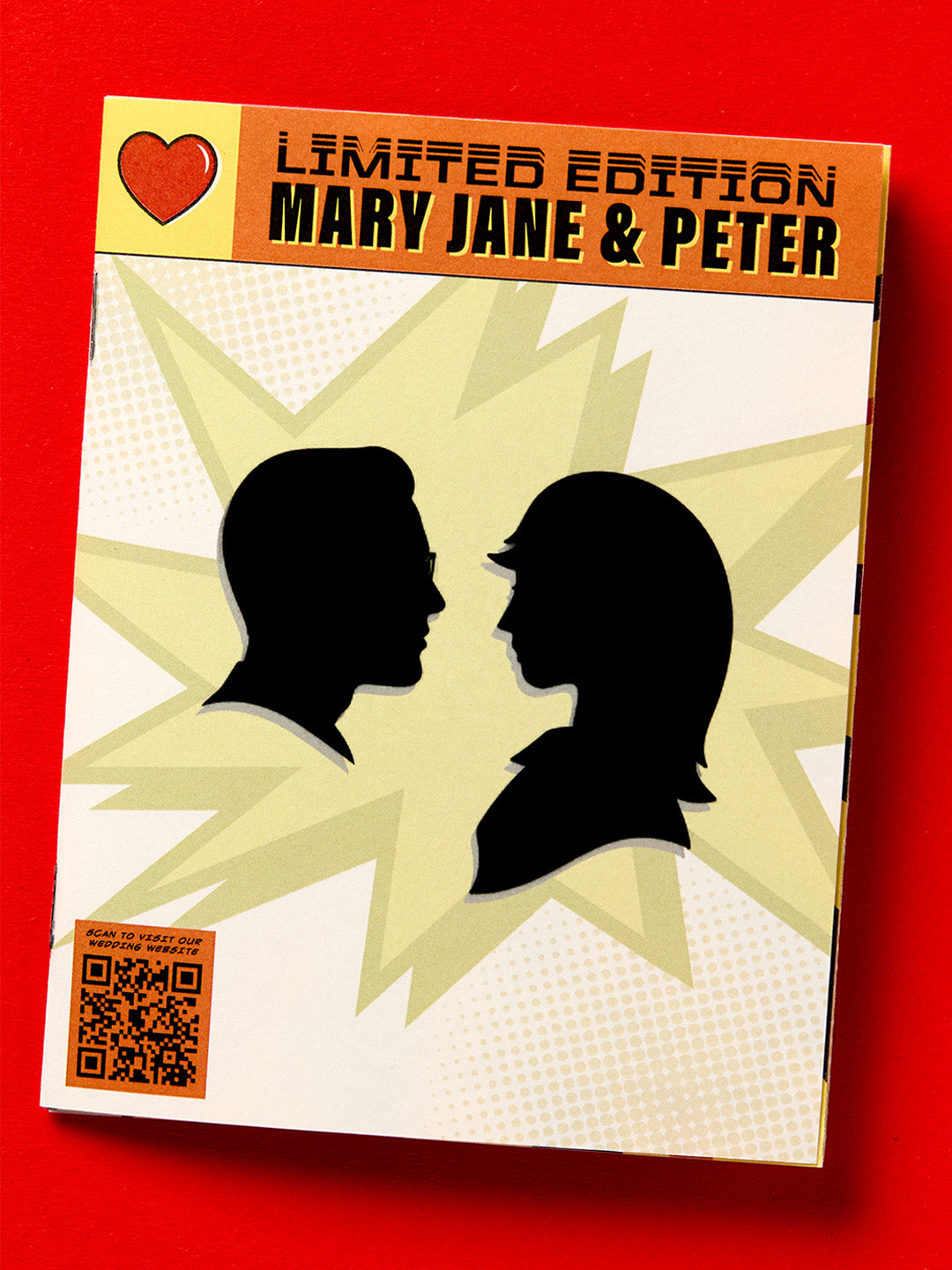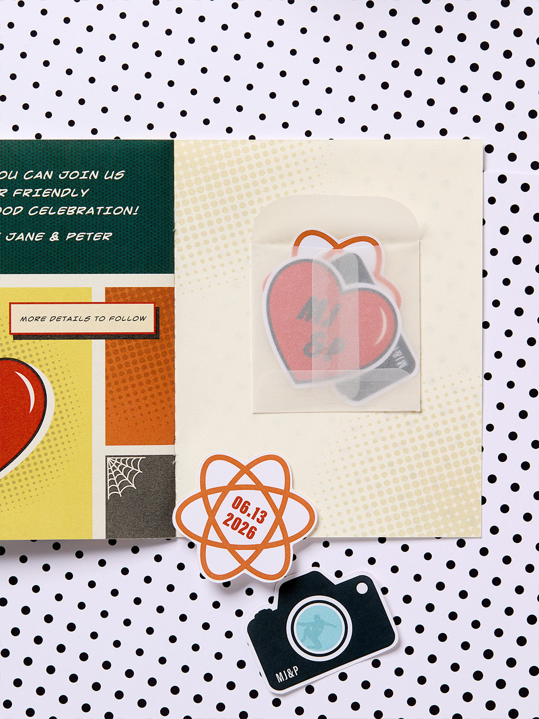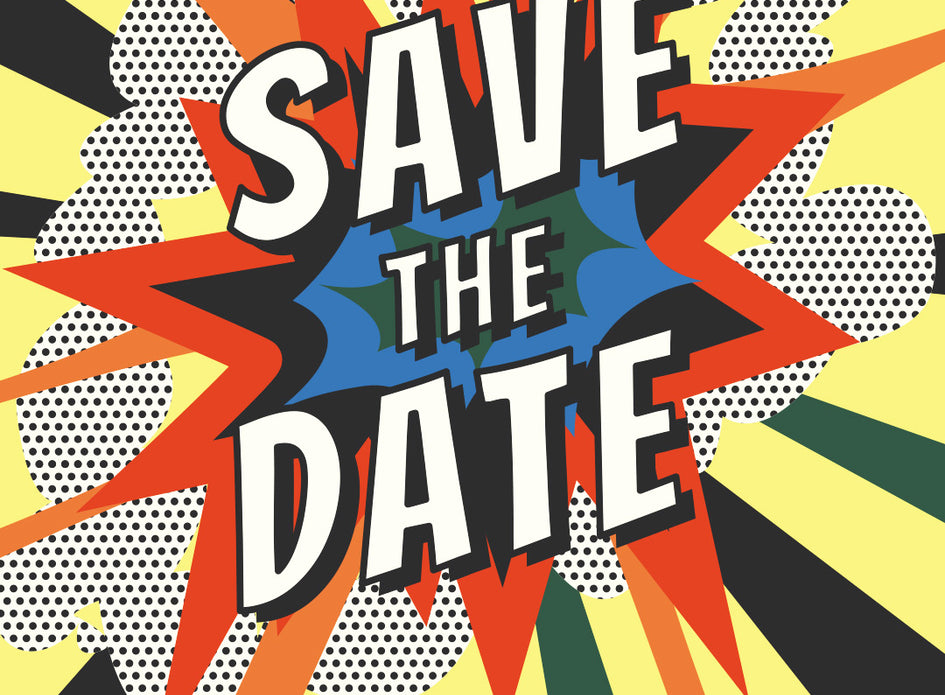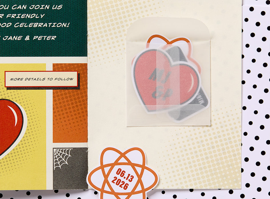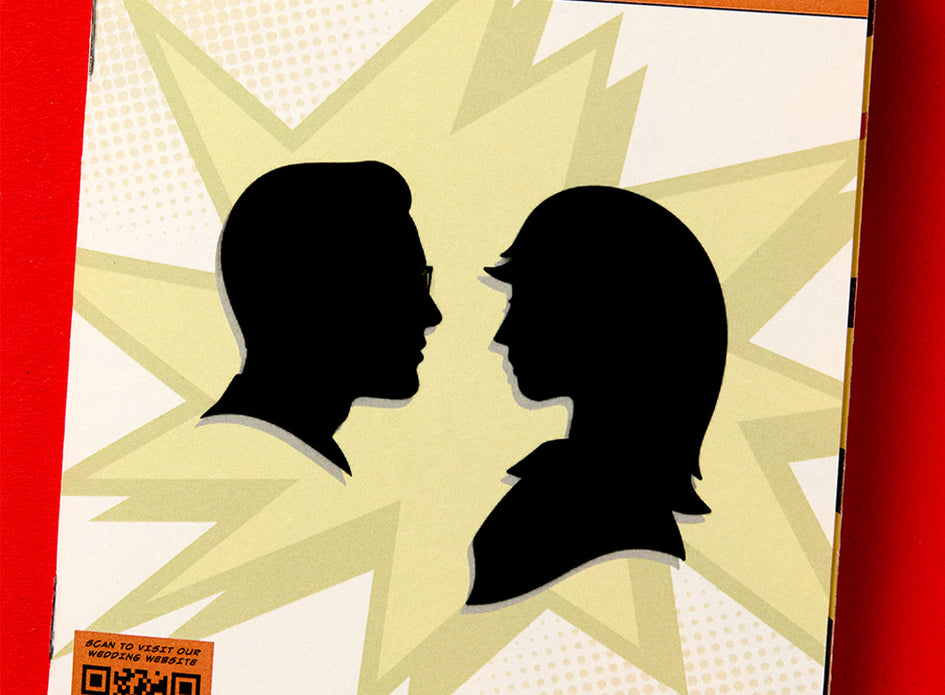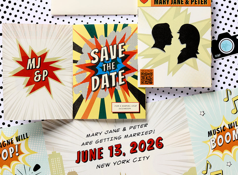 The save the date is designed as a mini comic book, arriving in guests’ mailboxes in a clear bag reminiscent of in-store packaging.
