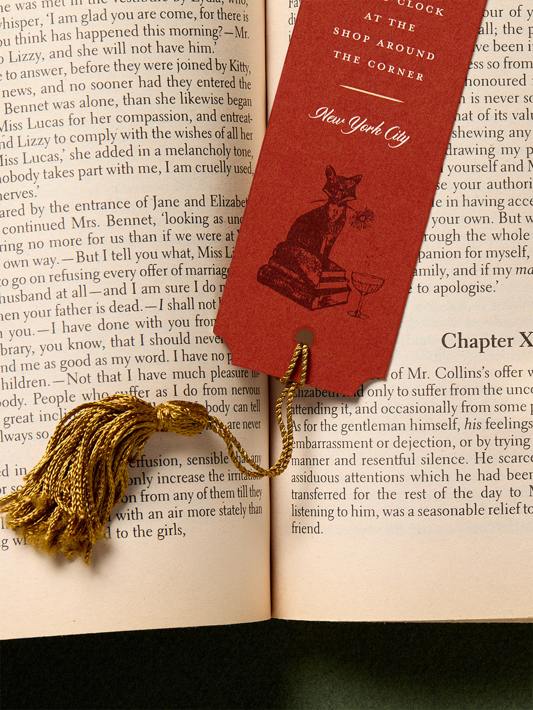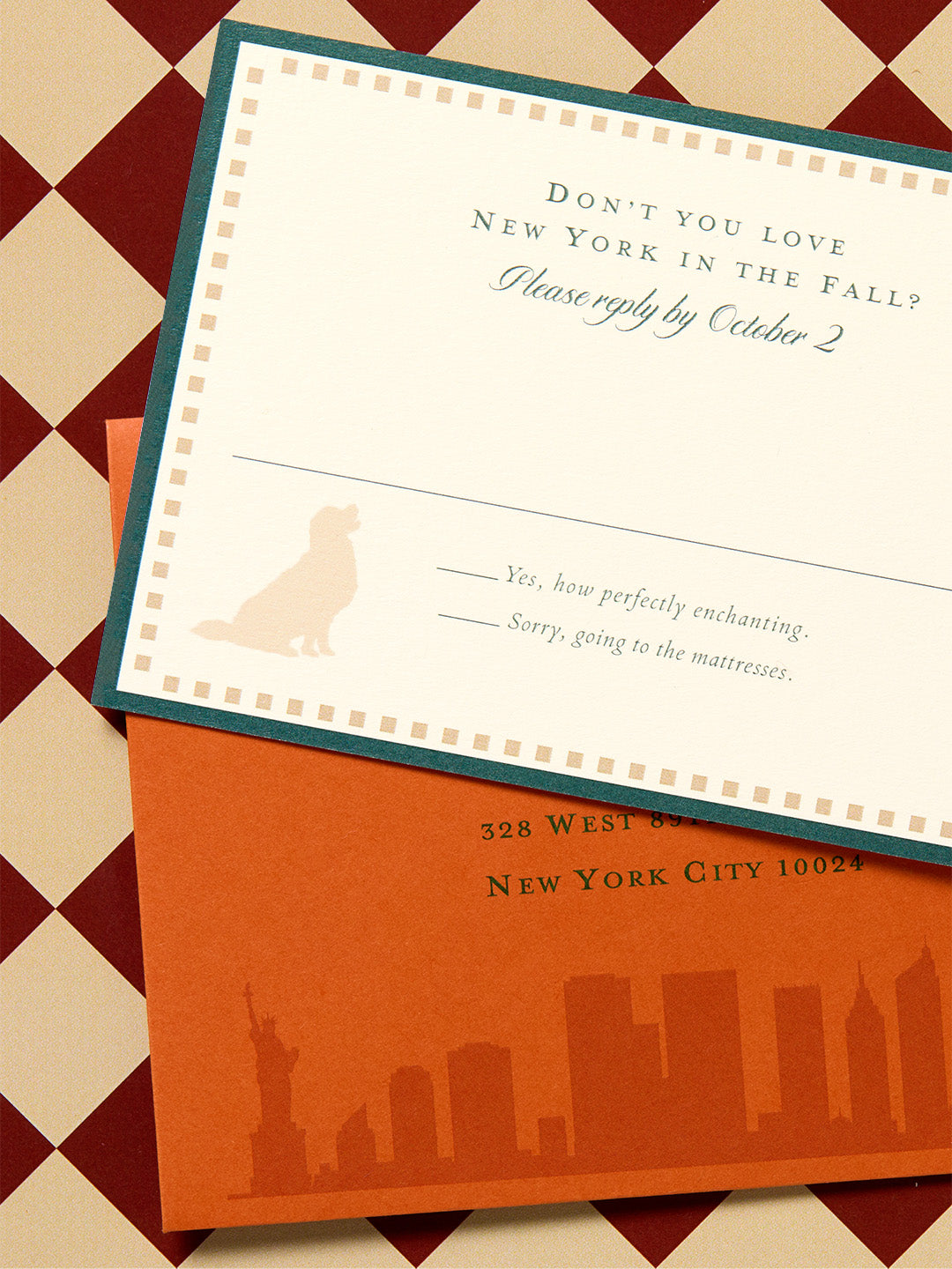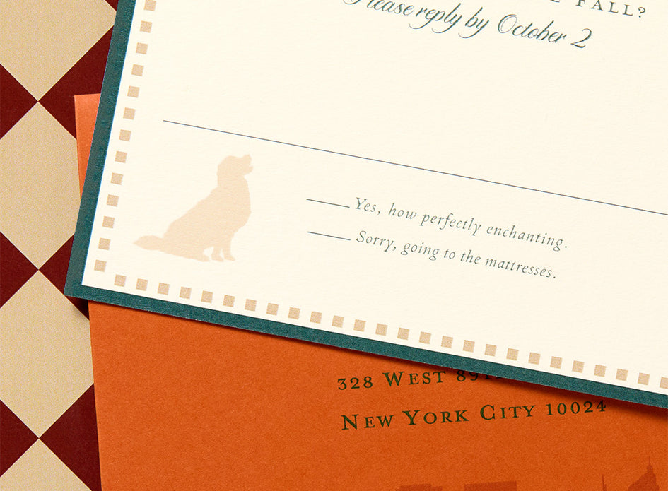 The wedding takes place in Riverside Park, the setting of the movie’s final scene. The reception insert is a bookmark as a nod to the couple’s industry. In our fictional world, the reception is somehow able to be held at The Shop Around The Corner (let’s assume it did not become “something really depressing, like a Baby Gap”). The front features the iconic F-O-X, while the back features a checkered pattern inspired by the store’s floors.
