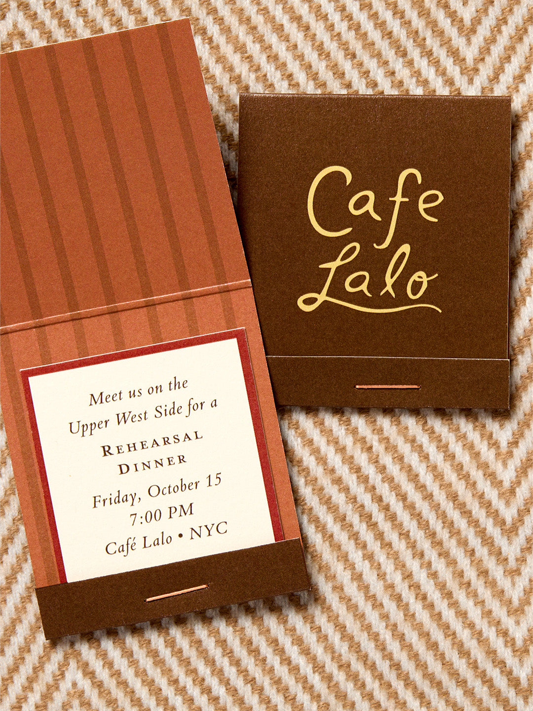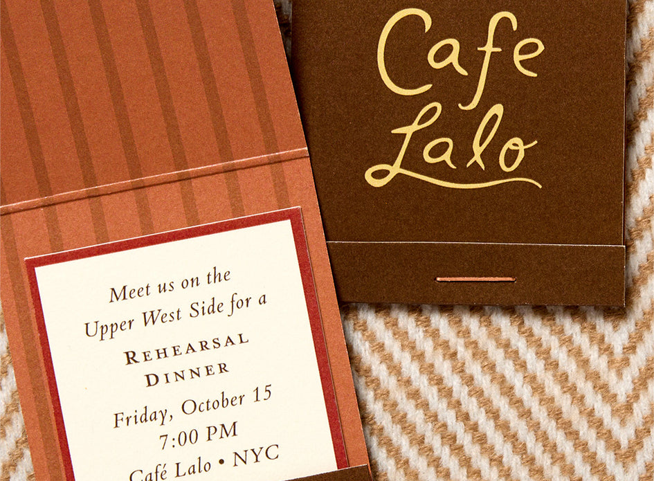 The rehearsal dinner will be held at Café Lalo, the iconic eatery where Joe and Kathleen were to have their first date. Typography is inspired by the venue’s neon sign, and the format is a nod to classic NYC restaurant matchbooks.