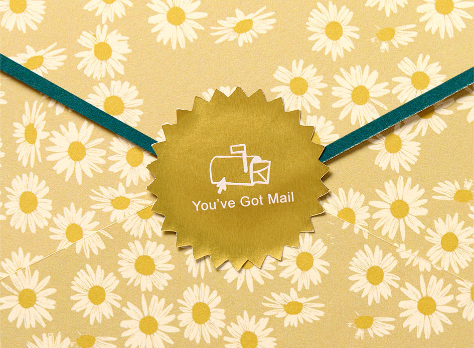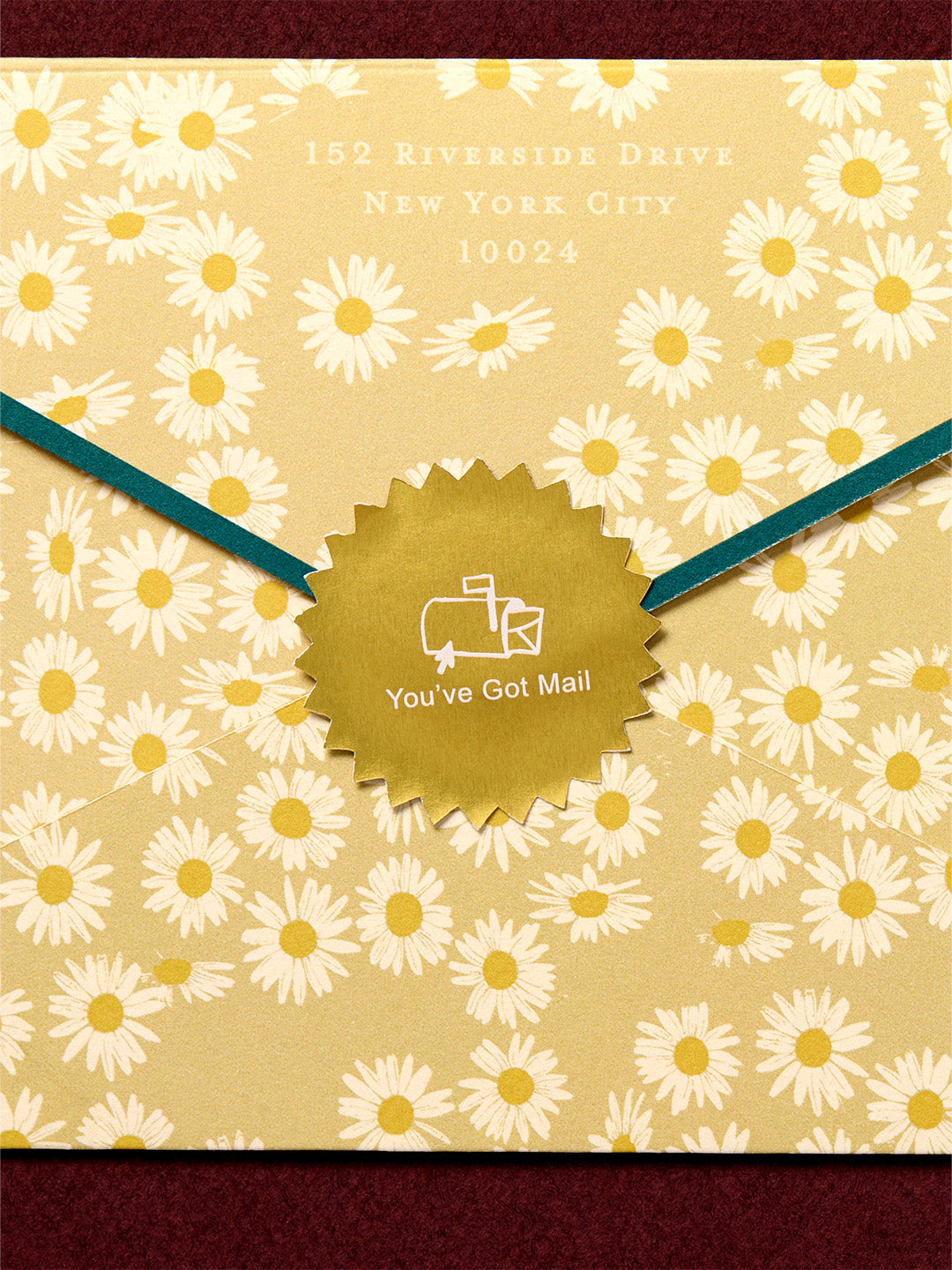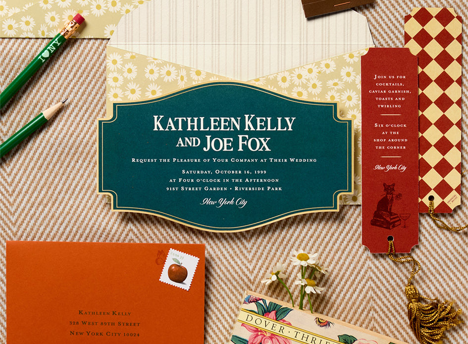 It doesn’t matter that the wedding is to be in the fall, the outer envelope is covered in daisies (“the friendliest flower!”, Kathleen’s favorite) and sealed with the classic 90s “YOU HAVE MAIL” emblem. The envelope holds a dark green invitation shaped and styled like Kathleen’s iconic Shop Around the Corner bookstore sign.
