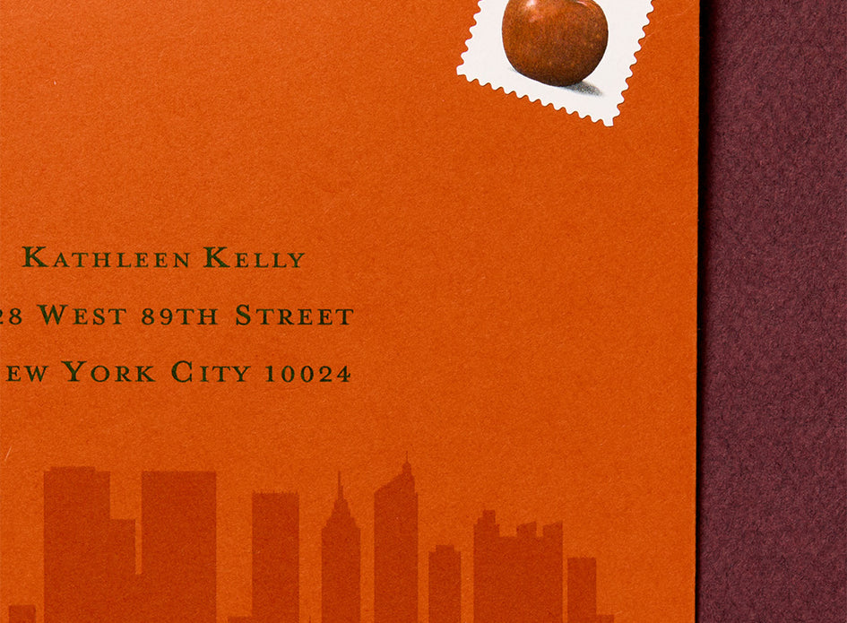 The reception card features one of the best questions from the beginning of the movie – “Don’t you just love New York in the fall”) and a warm yellow envelope inspired by “bouquets of freshly sharpened pencils.”