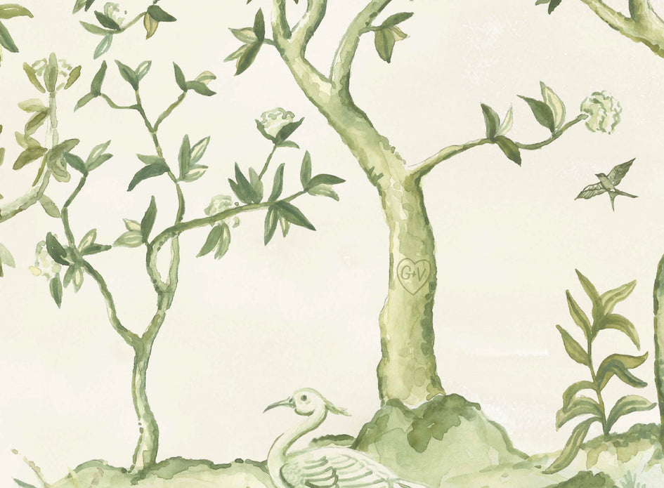 Forgoing a hero logomark didn’t mean a lack of ownership. Personalization and symbolism abounded at every turn, from the chinoiserie illustration we modeled after the venue’s mural to the couple’s initials we blended into each event’s design. Do you see the G+V carved into the tree? (Bonus points if you can you spot all the initial instances!).