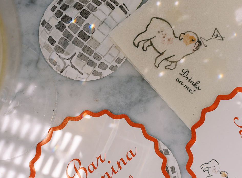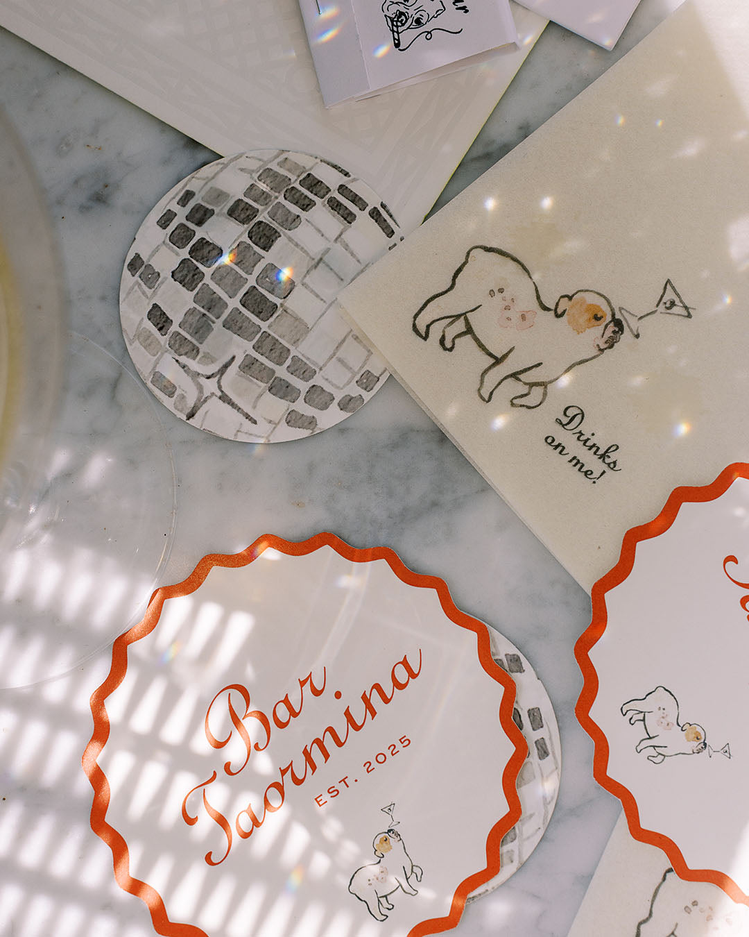 We put the “marry” in marinara with our bright tomato red color palette and patterning for G+V’s Italian-seasoned welcome party, a fitting them given the groom’s heritage. Together with our matchbook event insert and delicious doodles inspired by the pizzeria, guests felt as though they were sipping a spritz in Sicily. And holy cannoli did the CBP account management team dress the part!
