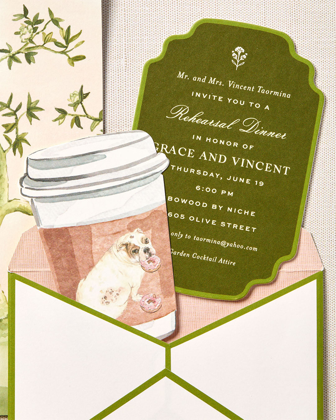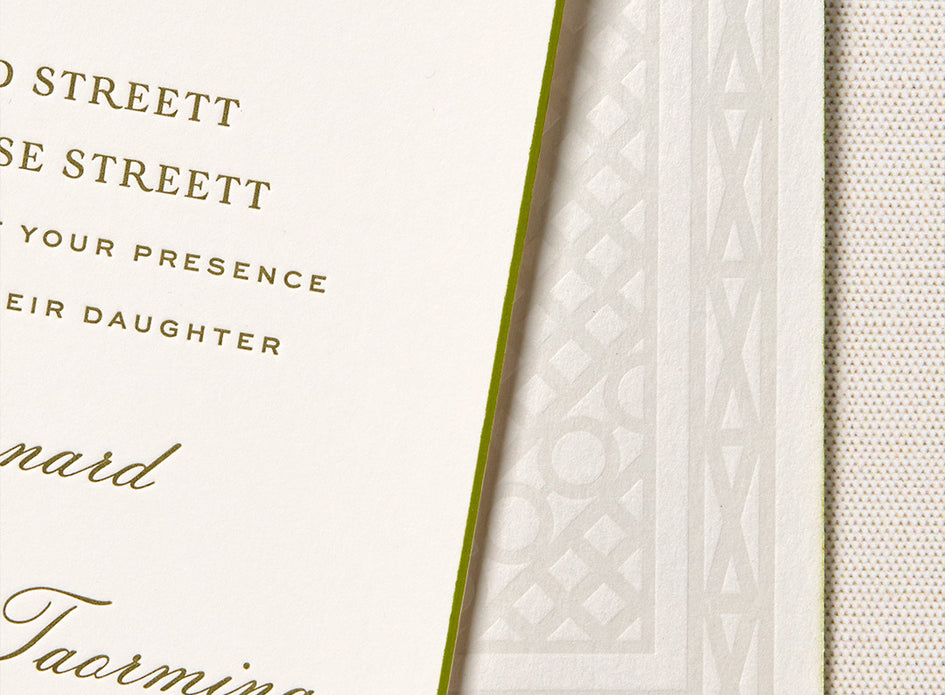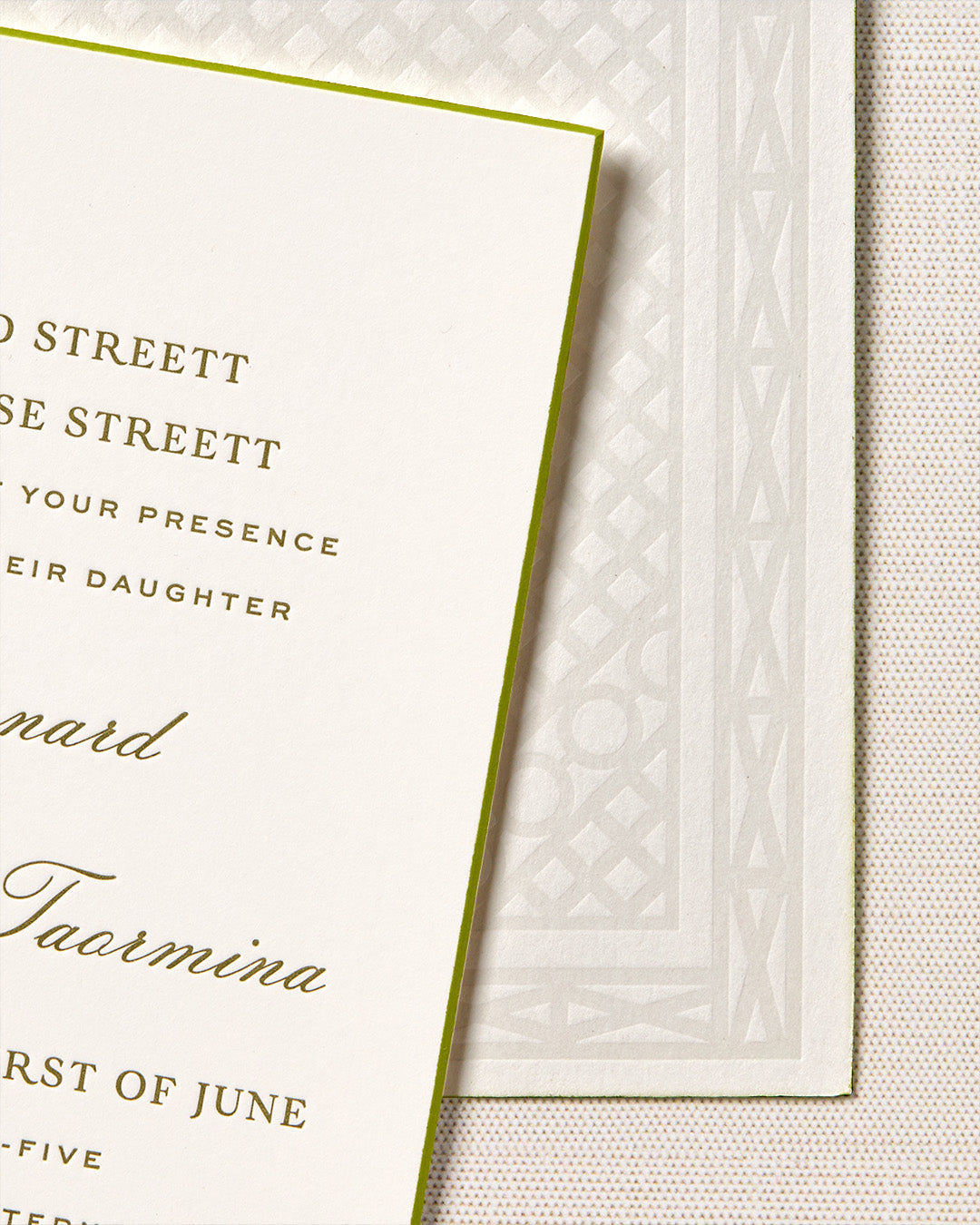 A green beveled edge and blind debossed backer gave our traditional letterpress invitation a fresh twist. But guests uncovered even more playful surprises as they went into “The Details,” the petite envelope that housed individual event inserts in a variety of thematic shapes and sizes.