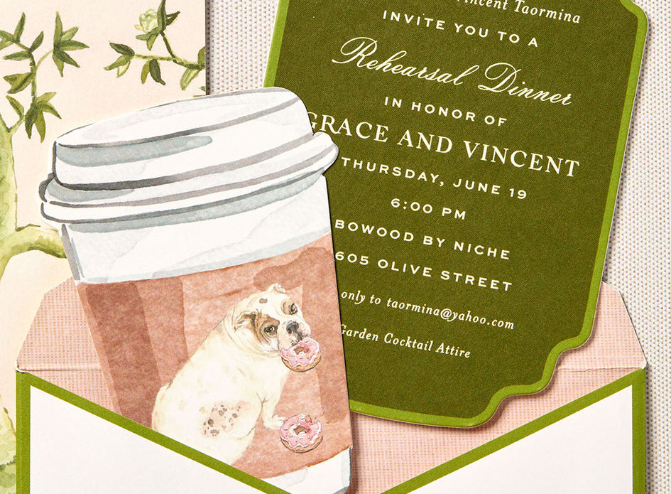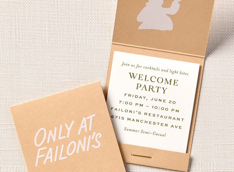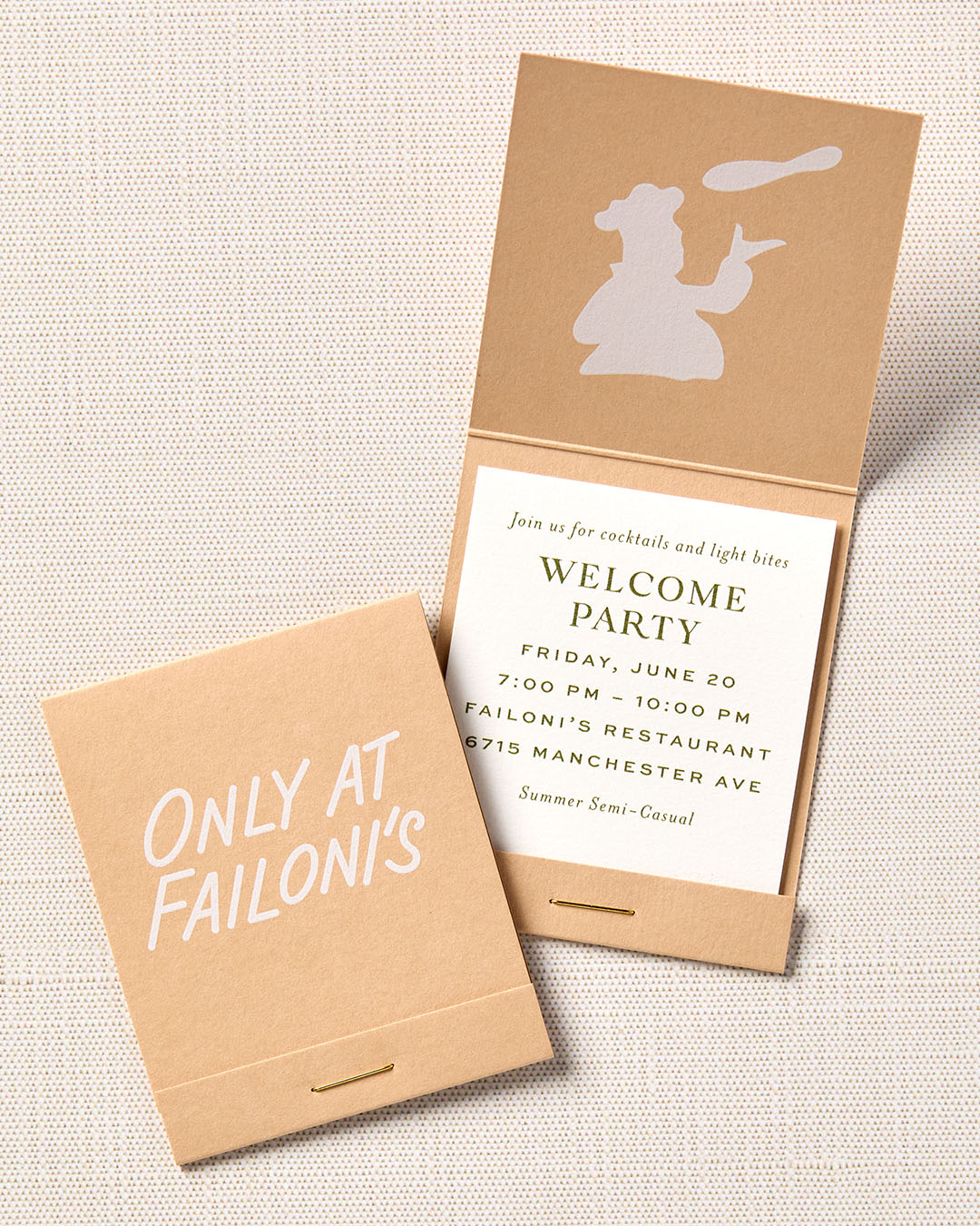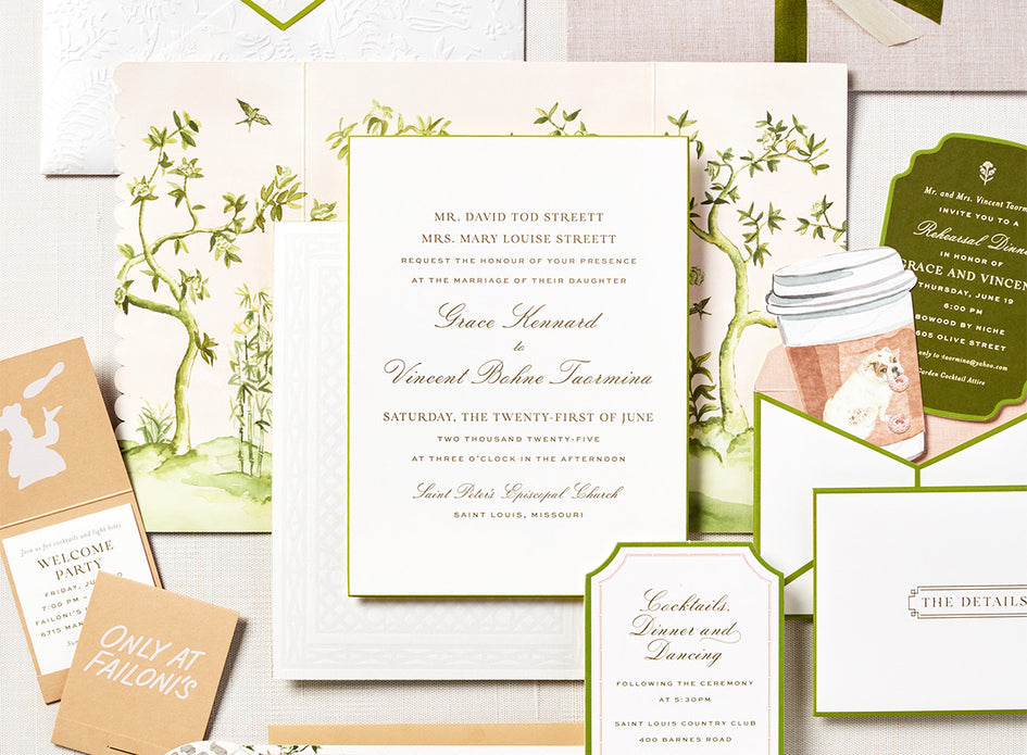 Guests couldn’t get enough of our booklet-style save the date for G+V. The die-cut scalloped linen cover was just a taste of the kernels of creativity within – a charming iconographic watercolor pattern, a save the date card mounted on a historic bird’s eye view of St. Louis, a his-and-hers favorite spots feature and the pièce de resistance – the popcorn pull-out, a nod to their wedding venue and its signature snack.