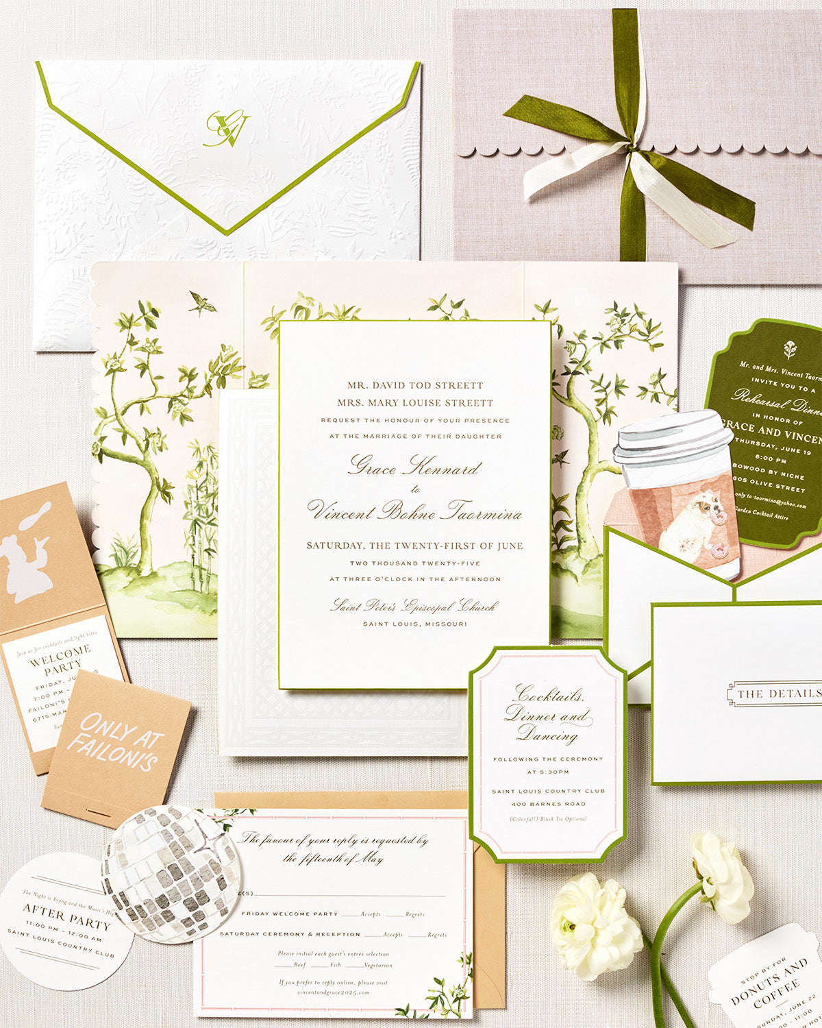 Our primary branding and ancillary event identities embraced Grace’s penchant for quiet luxury, prioritizing materiality, form and craftsmanship. Linen accents and blind debossing added textural interest to the light summer sensibility inherent in the airy watercolors and softened shades of green and pink.