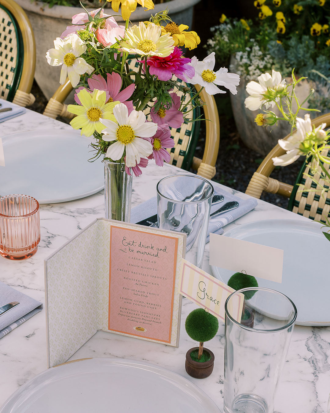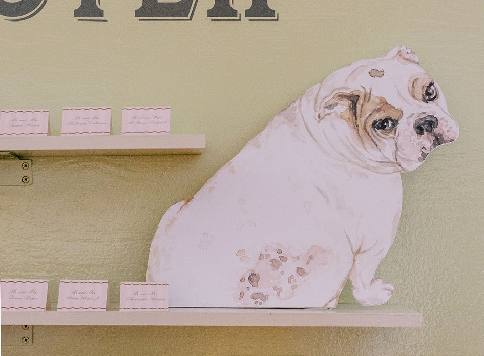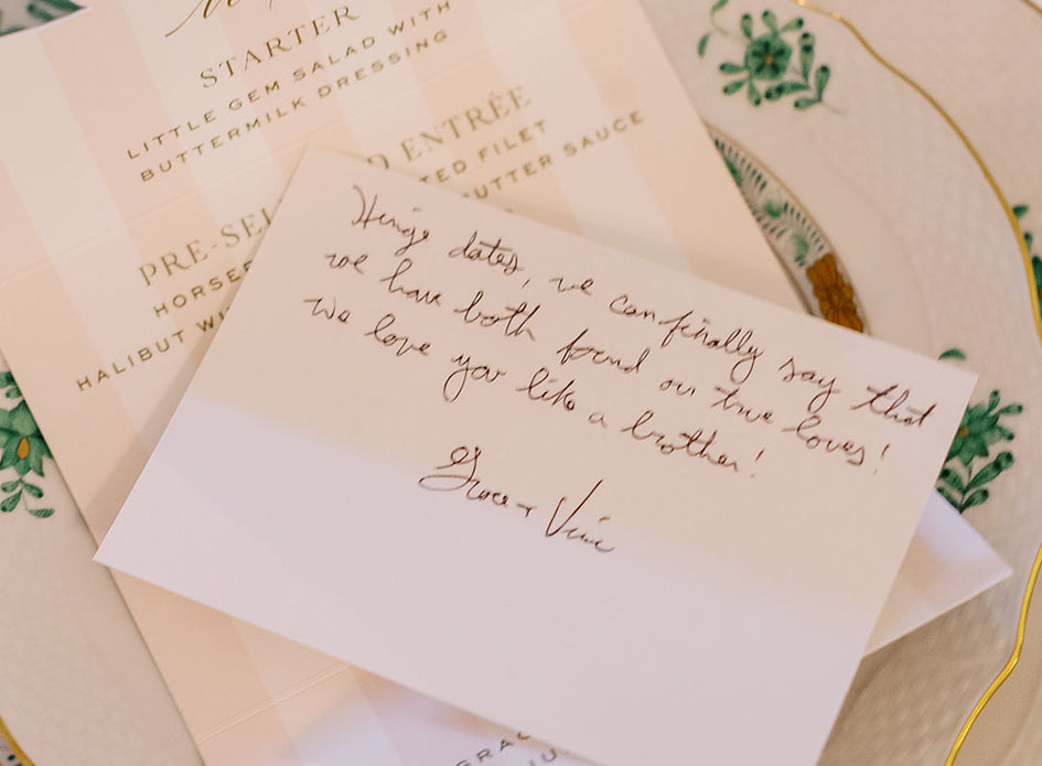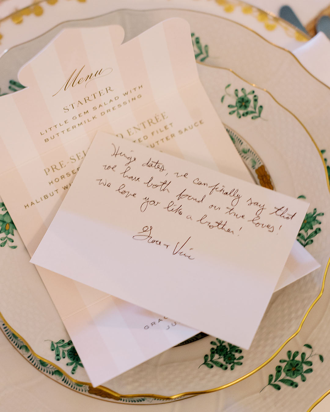 From the Sicilian wine tasting during cocktail hour to the doggone cutest escort installation featuring their beloved bulldog Rosie, the couple’s personalities were on full display across the big day. Guests found these individualized details even in the more unsuspecting places, such as the folio-style menus, where Grace and Vincent had tucked handwritten notes of appreciation for every single one of their 175 guests.