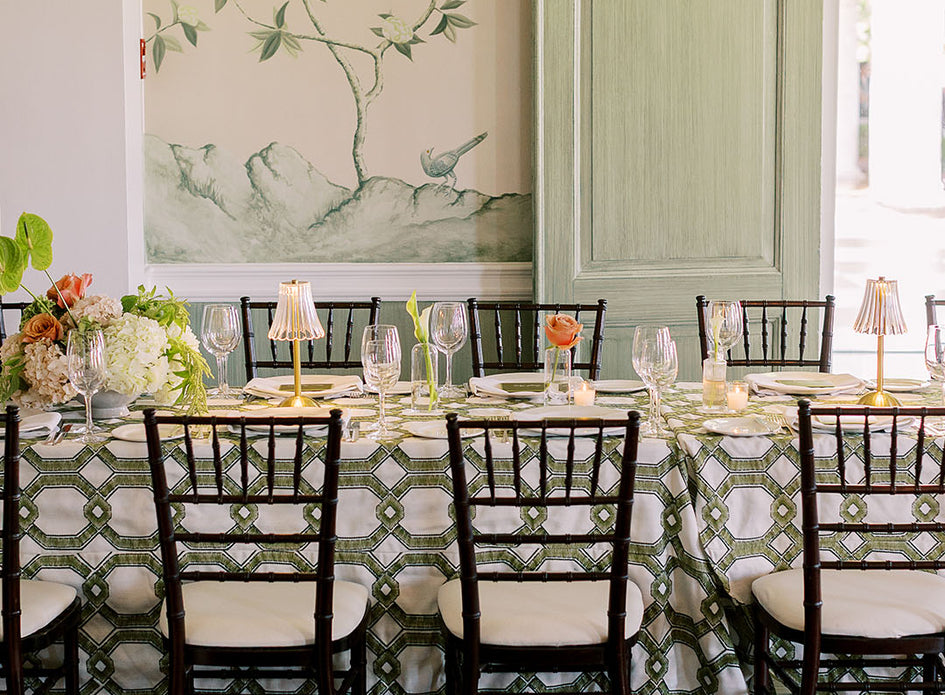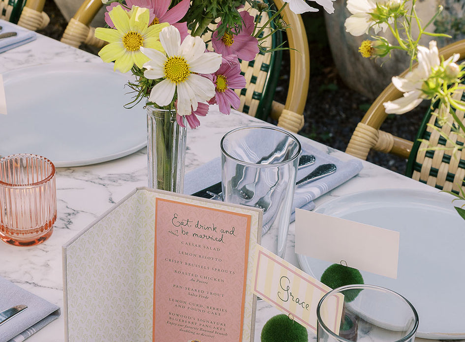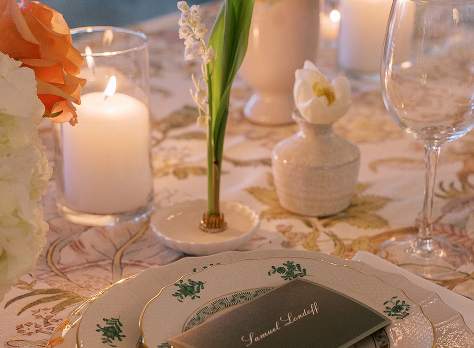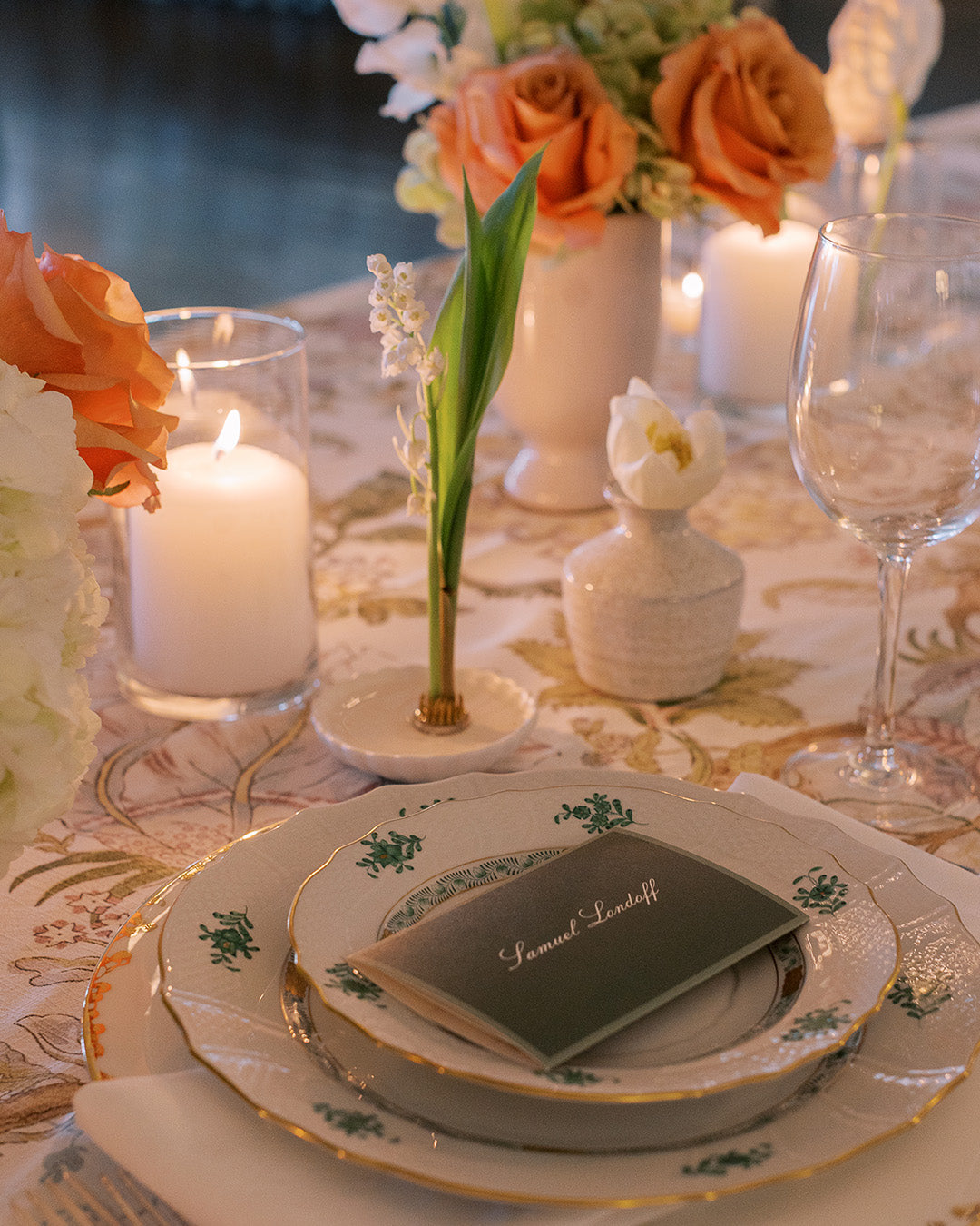 Our block print floral pattern for G+V’s rehearsal dinner – which stemmed from the subtle graphic detail on invite’s corresponding insert card – brought the garden ambiance to the table via cocktail napkins and hardbound menus.