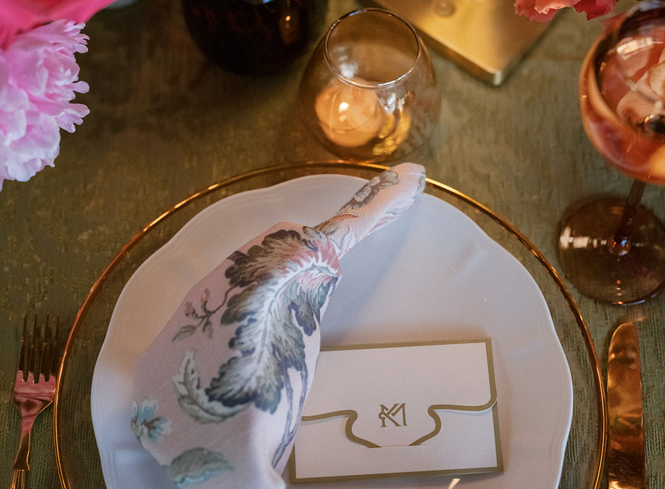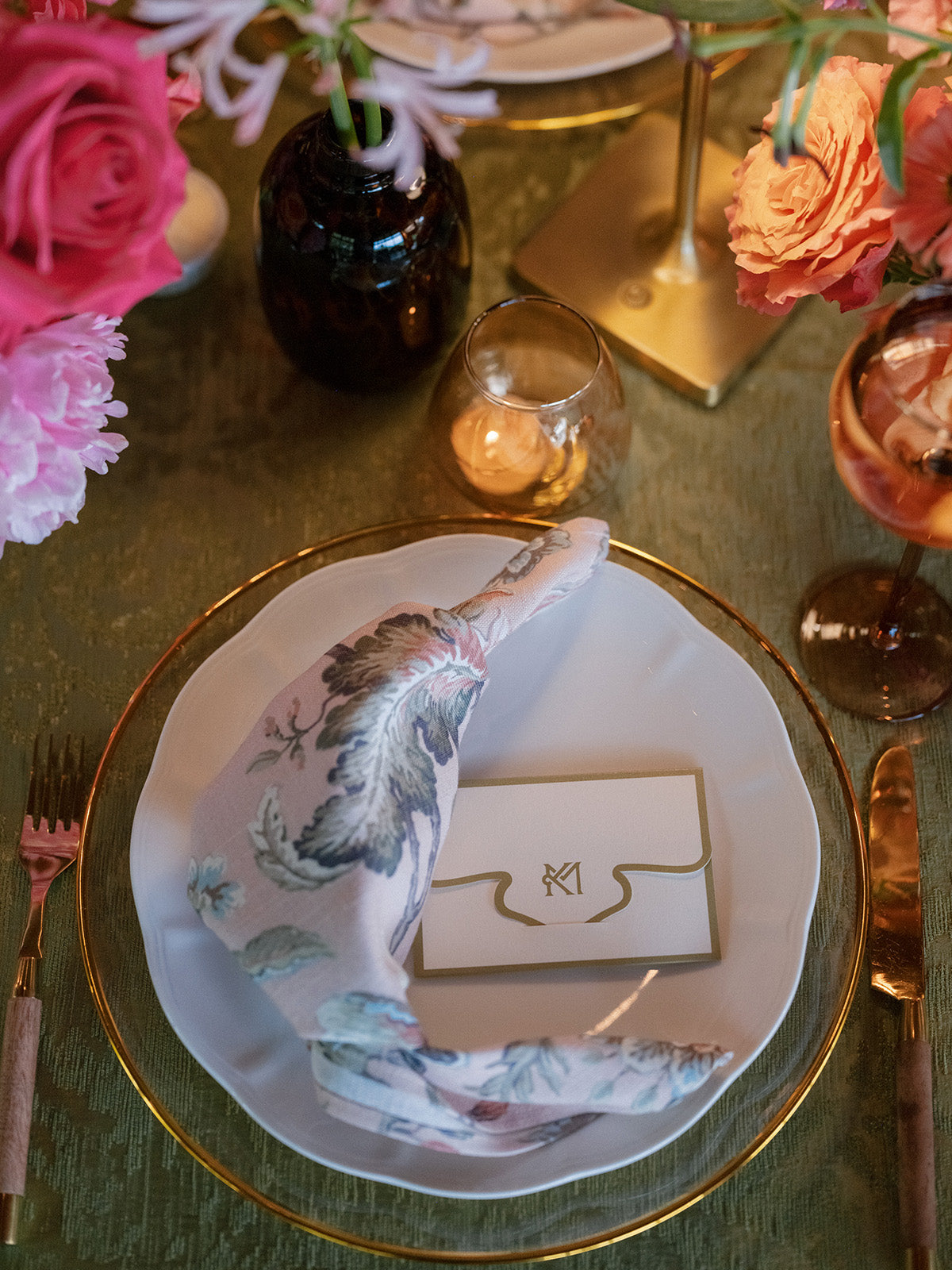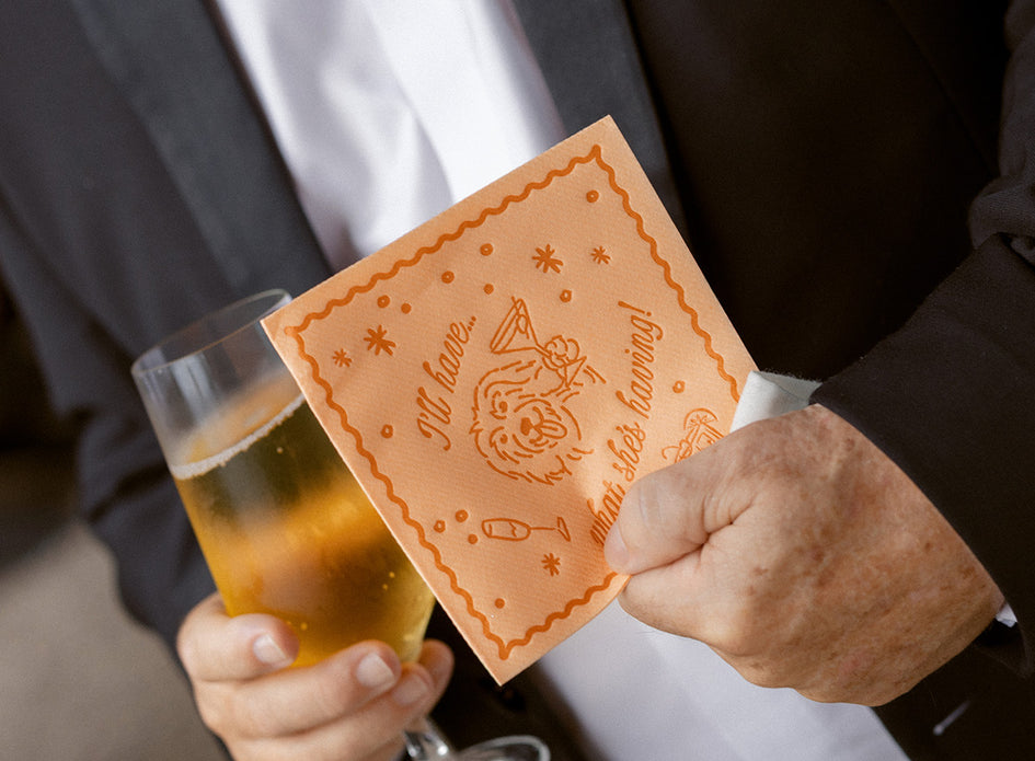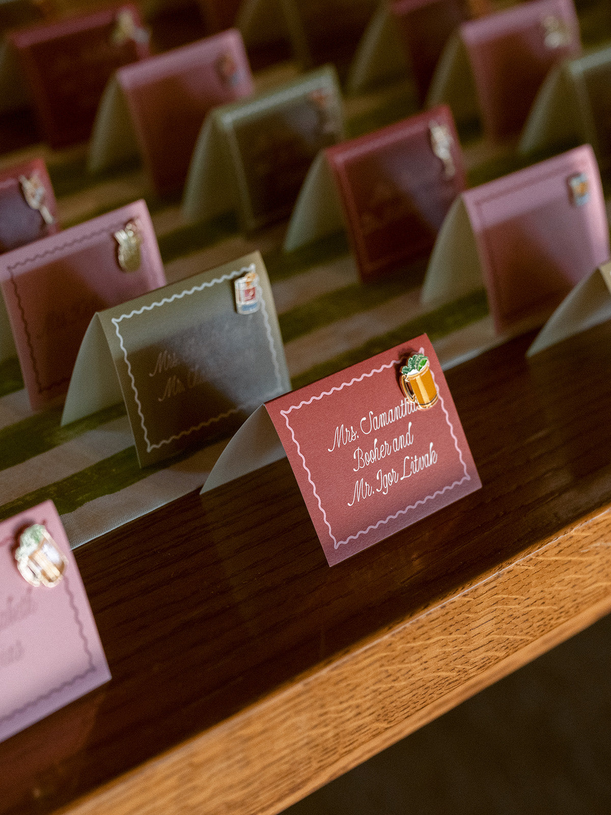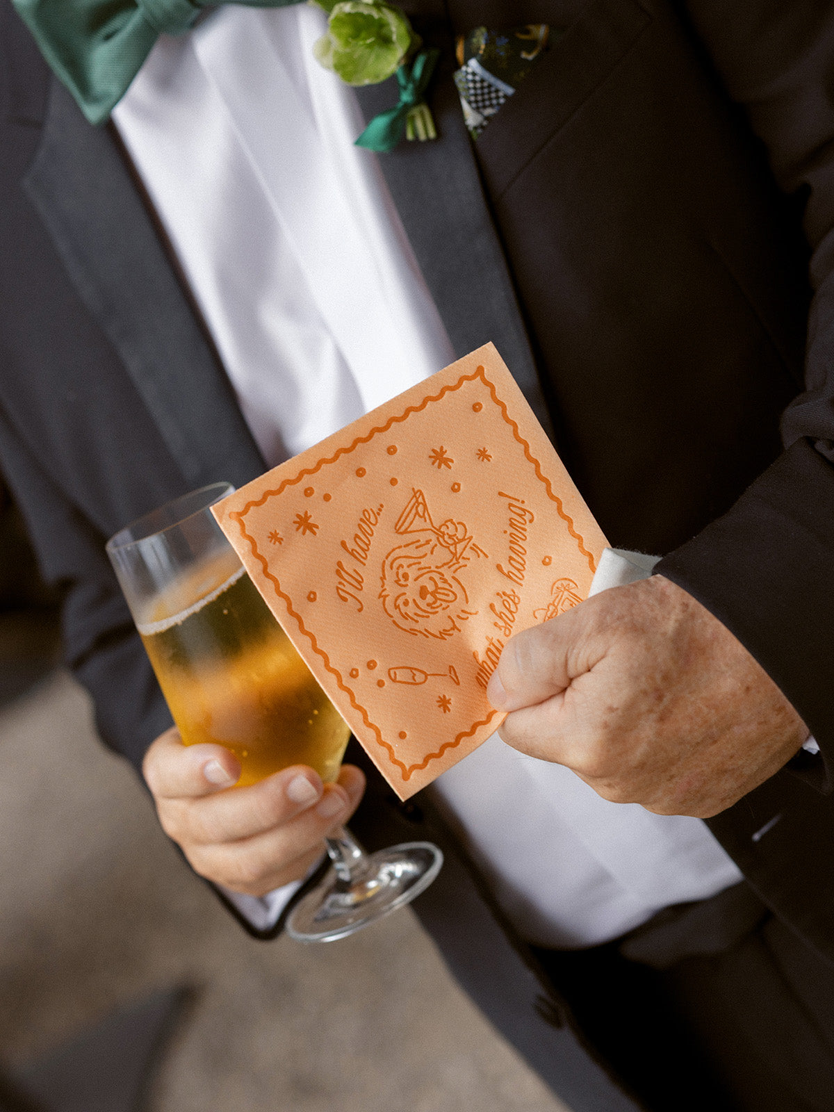 Commemorative enamel pins attached to escort cards, the mutt of honor/ boozy bar(k)tender gracing cocktail napkins, custom matchboxes that turned up the heat of the color palette – each of our designs for the big day itself was as intentional, eclectic and enviably cool as Keller and Mike.