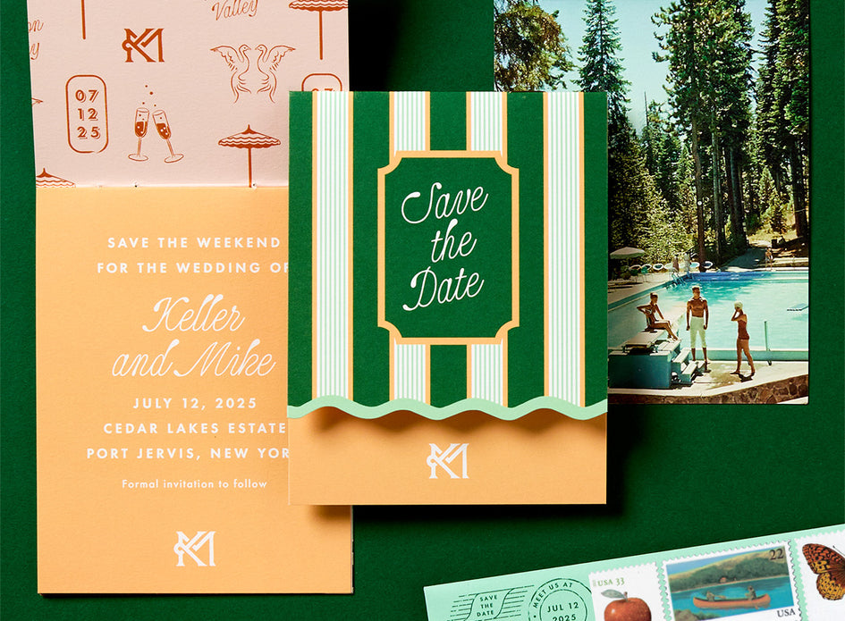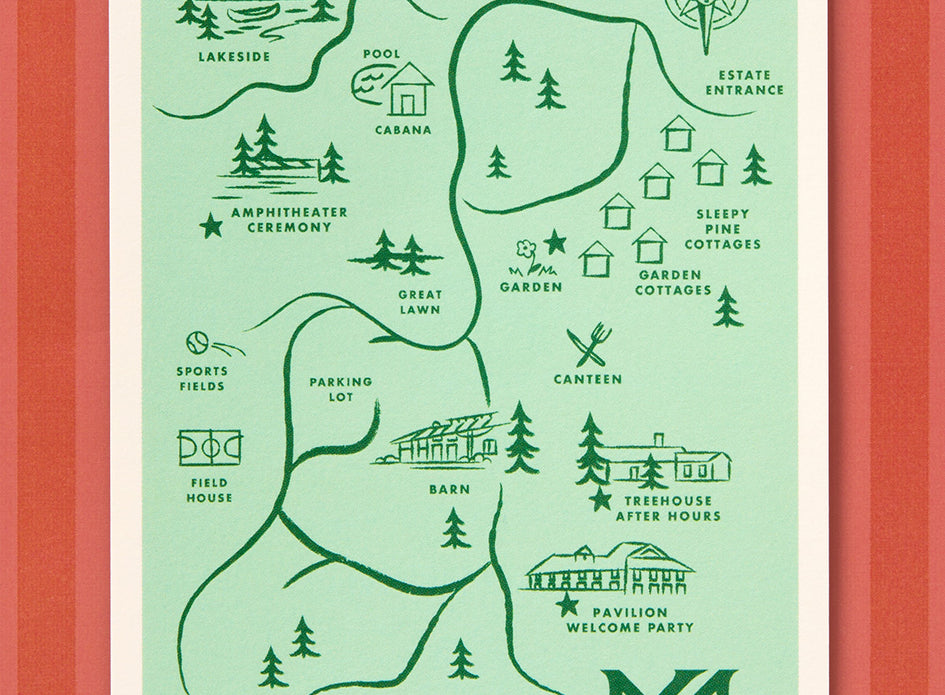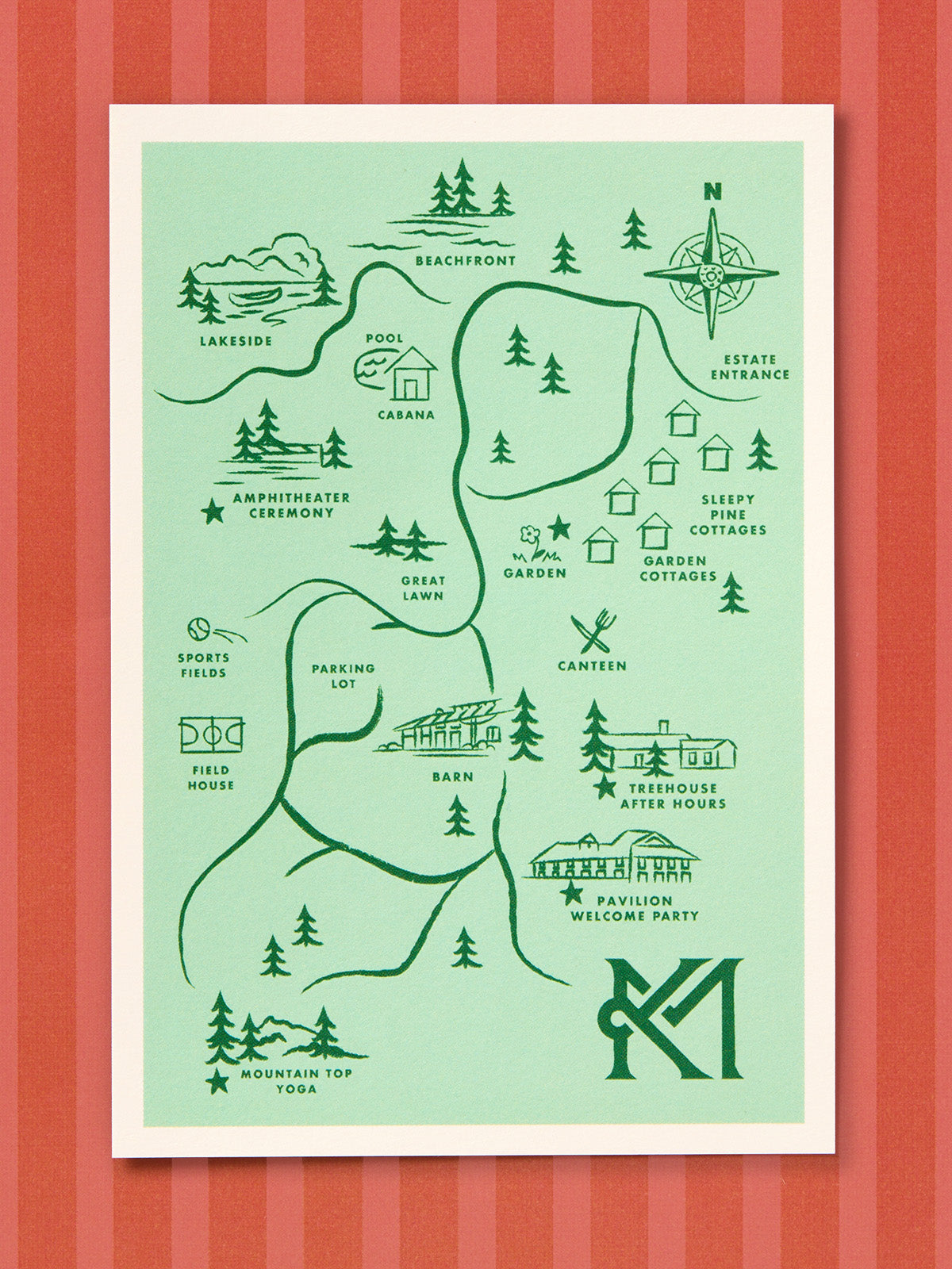 Our top-bound save the date booklet with its scalloped die-cut cover mimicked the edge of a market umbrella. Announcing more than Keller and Mike’s wedding, it immediately situated guests within the chic 60s summer camp dreamworld the couple wanted to create, introducing the vibes with a descriptive note, a simple sketched-out property map and vintage imagery.