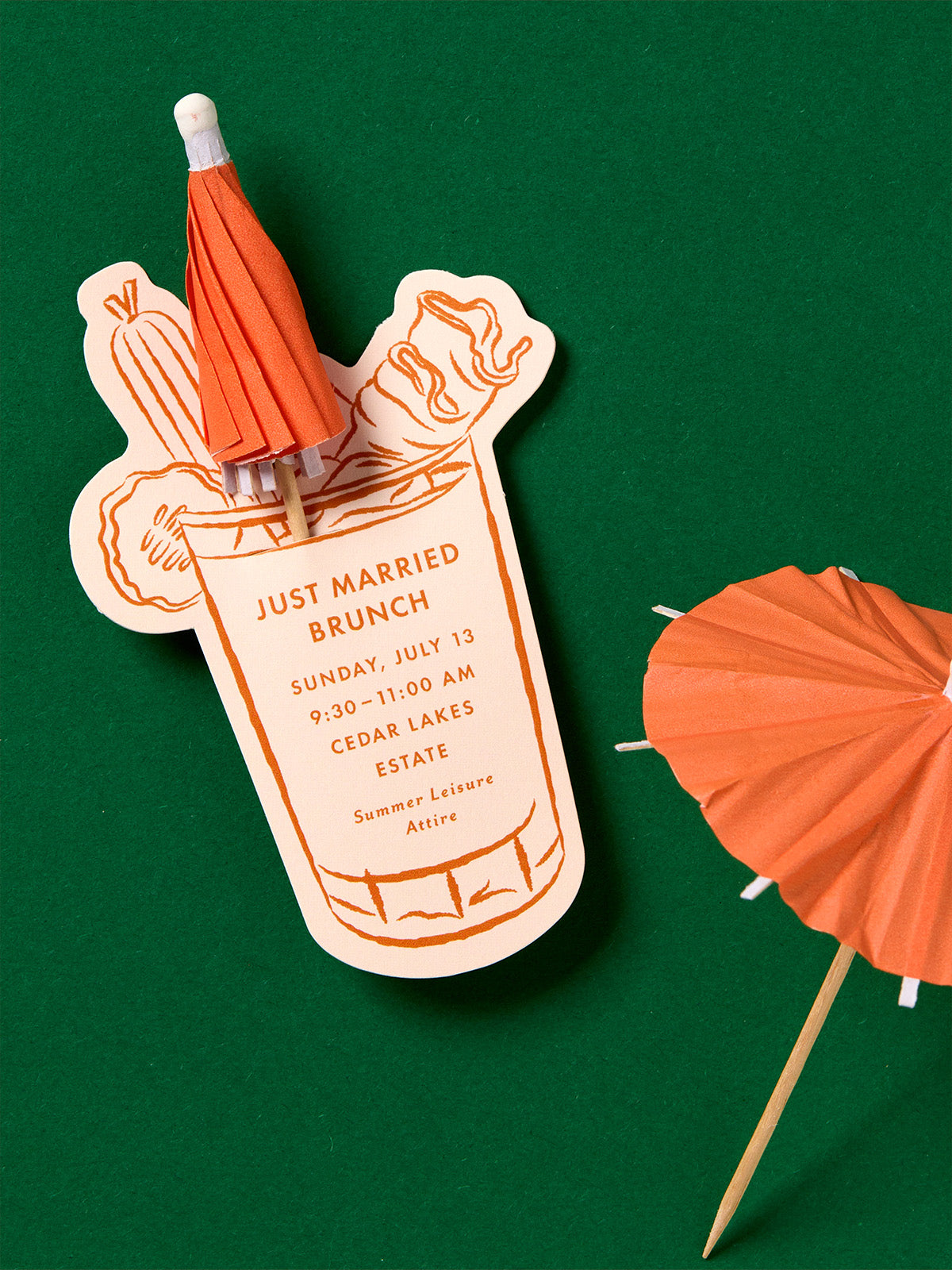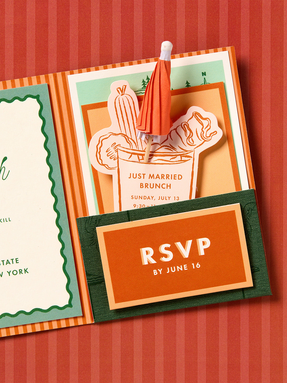 Pocket panels bookended either side to neatly organize weekend event info. From the Kickoff Cocktail scalloped coaster (featuring Caroline, of course!) to the Just Married Brunch Blood Mary (complete with functional drink umbrella), each paper morsel tantalized the eye. For our final unexpected trick, we made the request for RSVPs really pop with an expanding accordion fold.