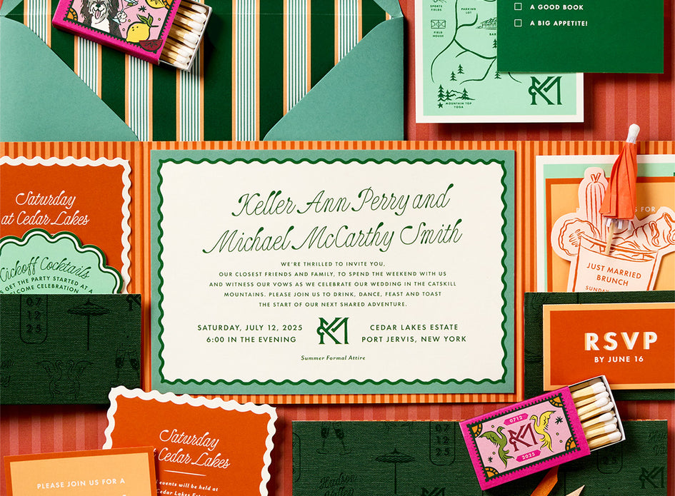 For their wedding at Cedar Lakes Estate, Keller and Mike envisioned a weekend retreat that radiated the fun-in-the-sun spirit of a 1960s summer camp. Cheree Berry Paper & Design enthusiastically answered their creative roll call! Without veering into rustic or kitschy territory, we crafted a charming visual story that brought a fresh air of sophistication to upstate New York nostalgia.