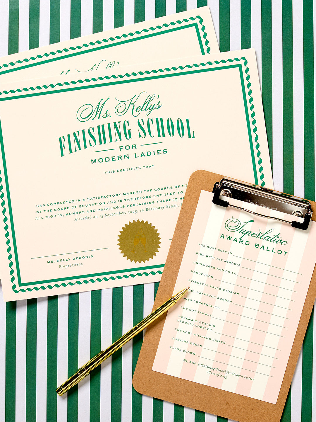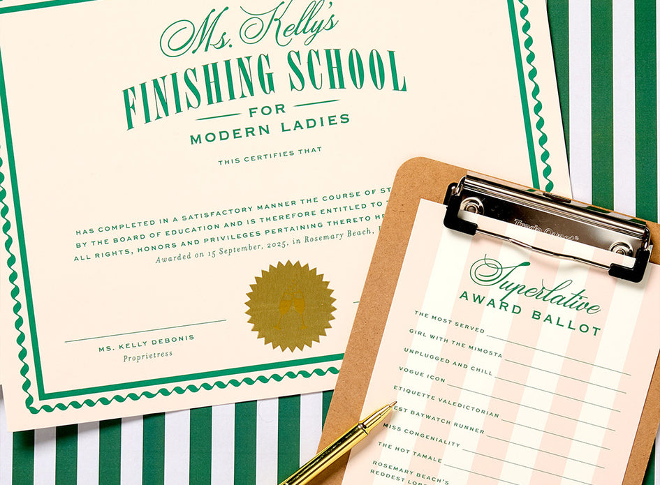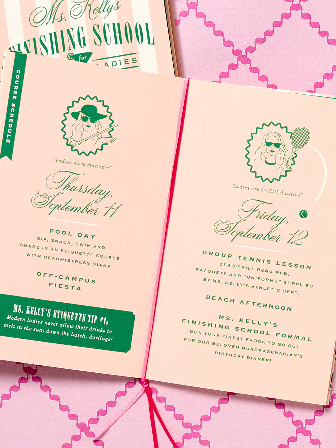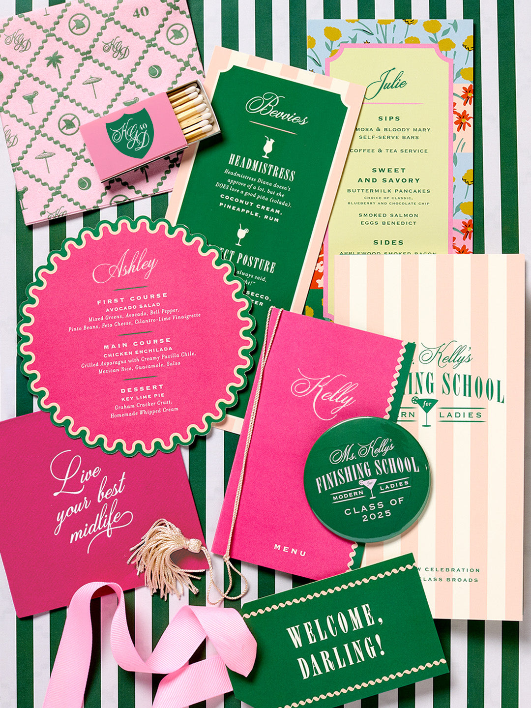 Welcome to Ms. Kelly’s Finishing School for Modern Ladies, where the standards are low, vibes are high and hands are only raised if holding a cocktail! For her 40th birthday, Kelly invited her closest group of friends to her Rosemary Beach party campus for a crash course in aging joyfully. To help put the cheeky in this charm school, Kelly tasked Cheree Berry Paper & Design with delivering a Troop Beverly Hills-meets-Palm Royale sensibility. And we understood the assignment…