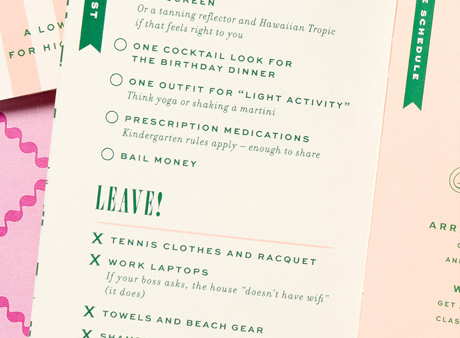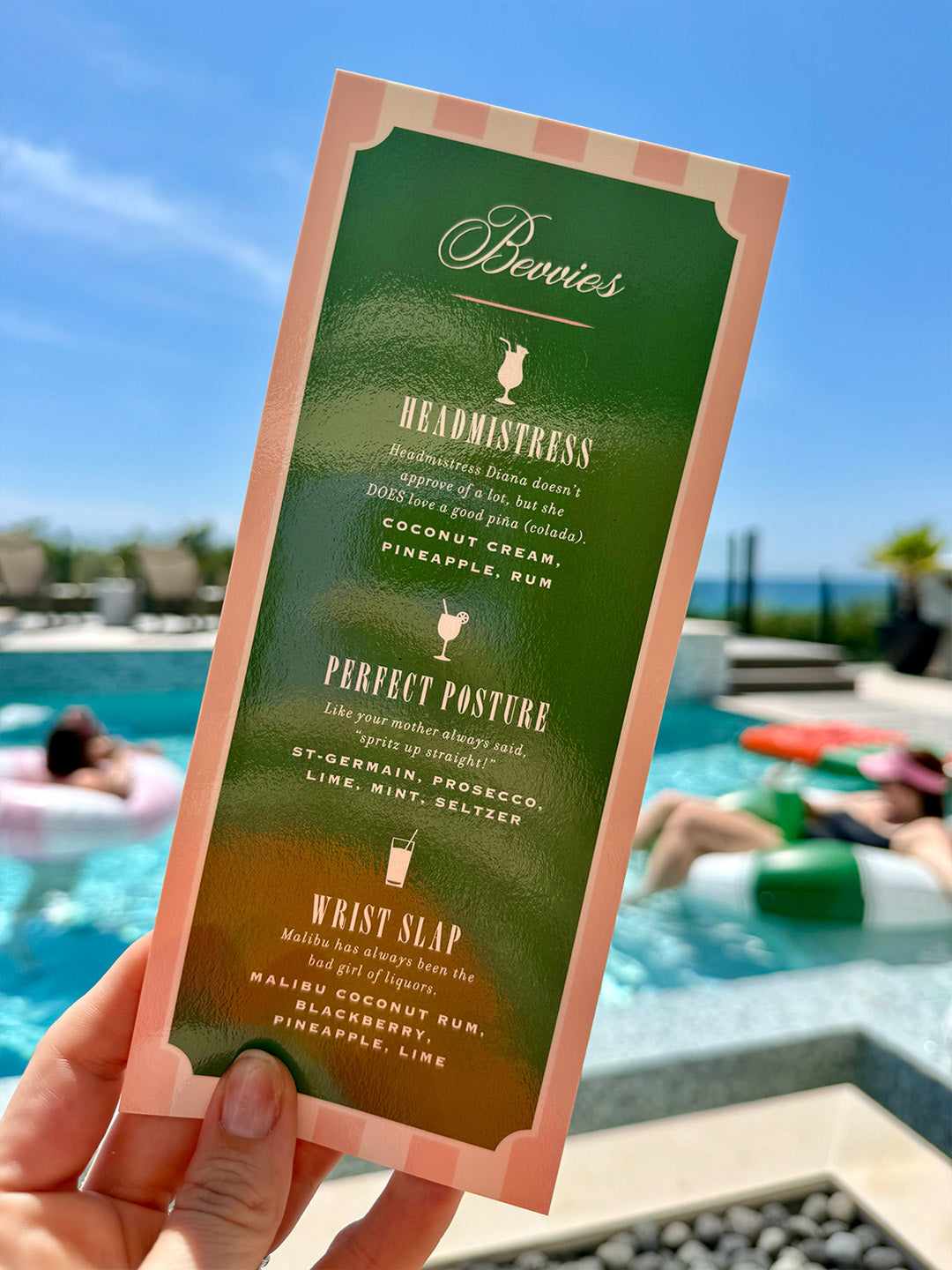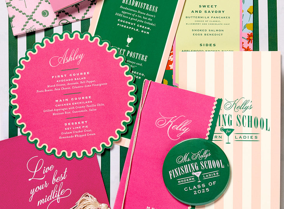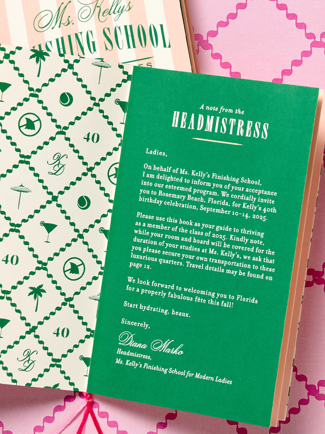Welcome to Ms. Kelly’s Finishing School for Modern Ladies, where the standards are low, vibes are high and hands are only raised if holding a cocktail! For her 40th birthday, Kelly invited her closest group of friends to her Rosemary Beach party campus for a crash course in aging joyfully. To help put the cheeky in this charm school, Kelly tasked Cheree Berry Paper & Design with delivering a Troop Beverly Hills-meets-Palm Royale sensibility. And we understood the assignment…
