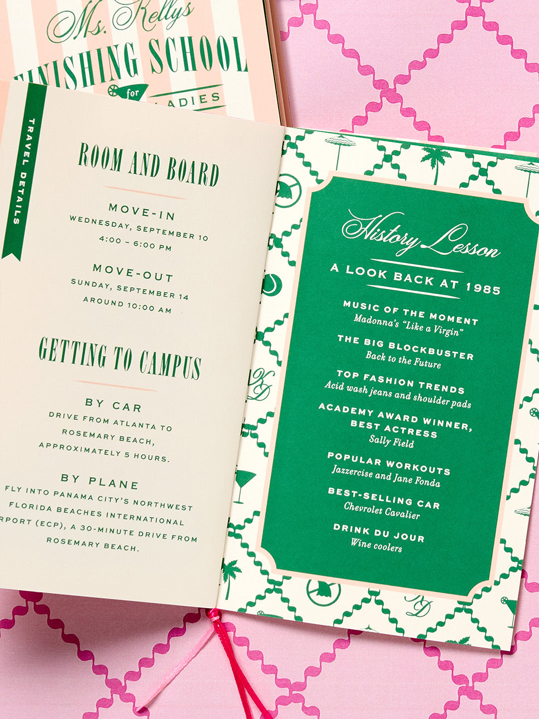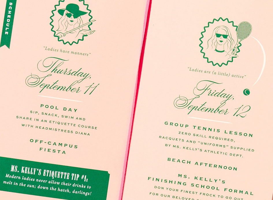 With the pink and green palette, cabana stripes, ricrac accents, saucy copy and charismatic array of Kelly mascots introduced in the admissions packet, guests knew this celebration would be anything but a snooze. Yet we ensured the visual identity remained polished by pairing the more playful elements with a formal school logo, flourished script and tidy organization.