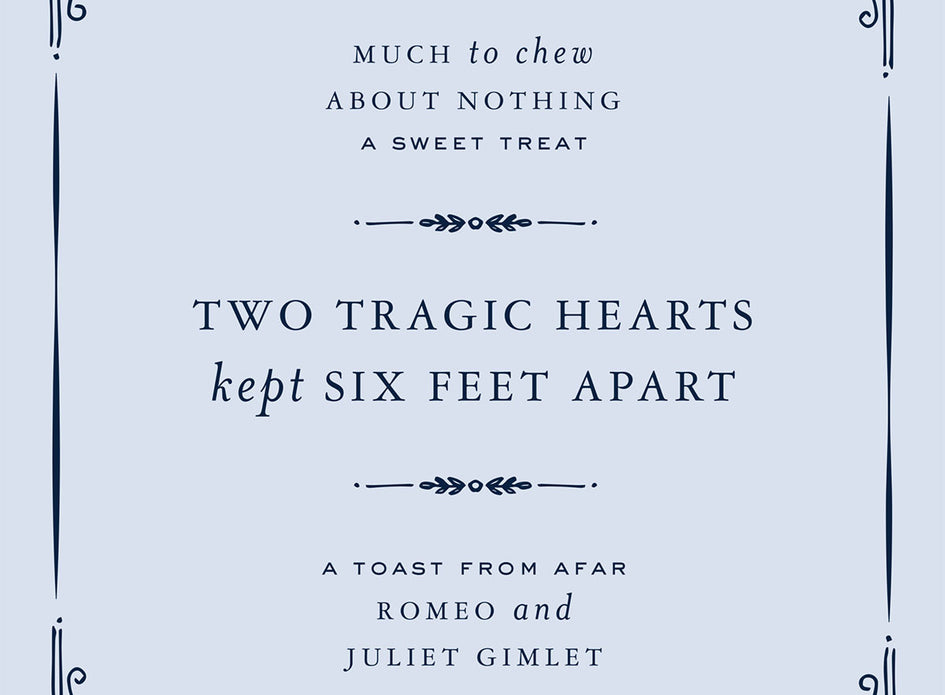 Two tragic hearts kept six feet apart! We took cues from some of Shakespeare’s famous prose and penned copy that spoke to the year’s unprecedented circumstances. An illustration of The Bard dressed in bunny slippers modeled the recommended attire for the evening—comfort couture—but encouraged the audience, “To thine own self be true” in their at-home approach to celebrating.