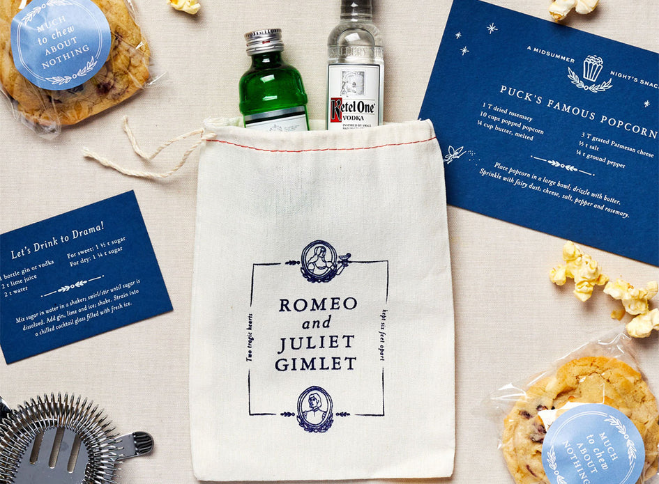 Attendees received their gala-in-a-box before the curtain rose on this virtual bash. Upon opening, they found a trove of neatly packaged and presented goodies, including a Romeo and Juliet-themed cocktail kit in a custom muslin bag, recipe cards for a midsummer night’s snack and quarantine comfort food and sweet treats wrapped with poetic stickers.