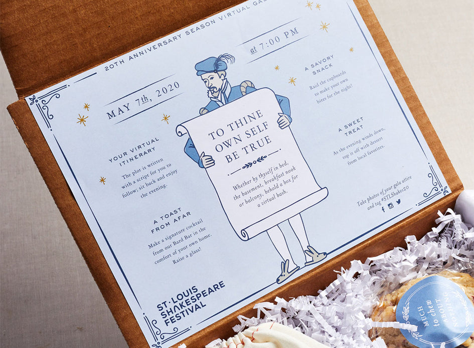 When the pandemic upended its original in-person gala plans, the St. Louis Shakespeare Festival questioned whether the event was to be or not to be. In order to toast its 20th anniversary and raise essential funds, the nonprofit adjusted and organized a virtual gala (quickly). With a bespoke box delivered to attendees’ doors, we helped increase excitement and anticipation and promoted its “Arts for all” motto anywhere and everywhere.