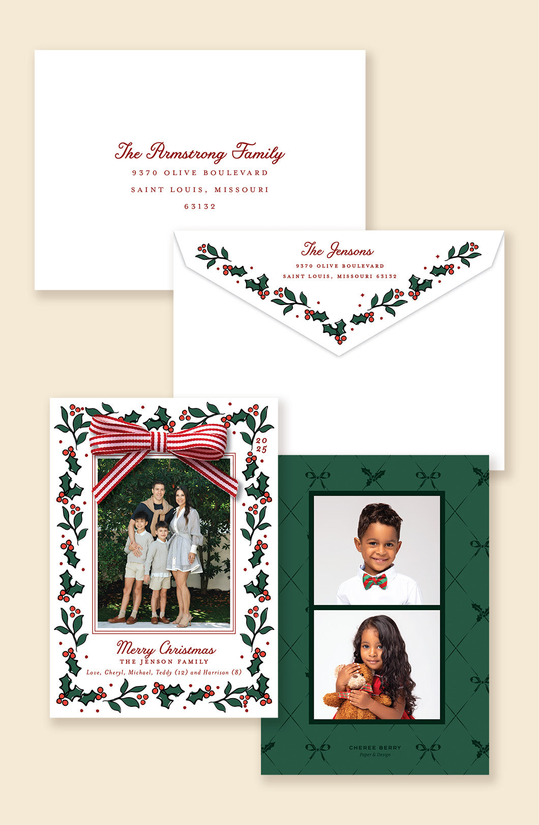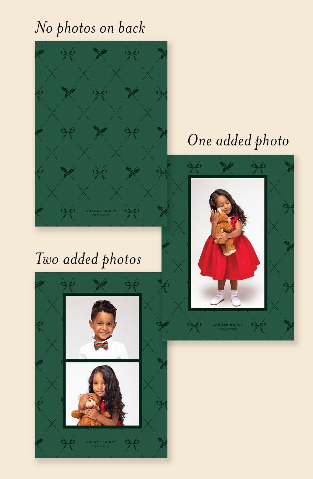 A classic Christmas look with charming detail, this card features your photo beneath a gingham-printed bow and is bordered by illustrated holly leaves and berries. A coordinating green patterned back and holly envelope artwork complete the timeless presentation.