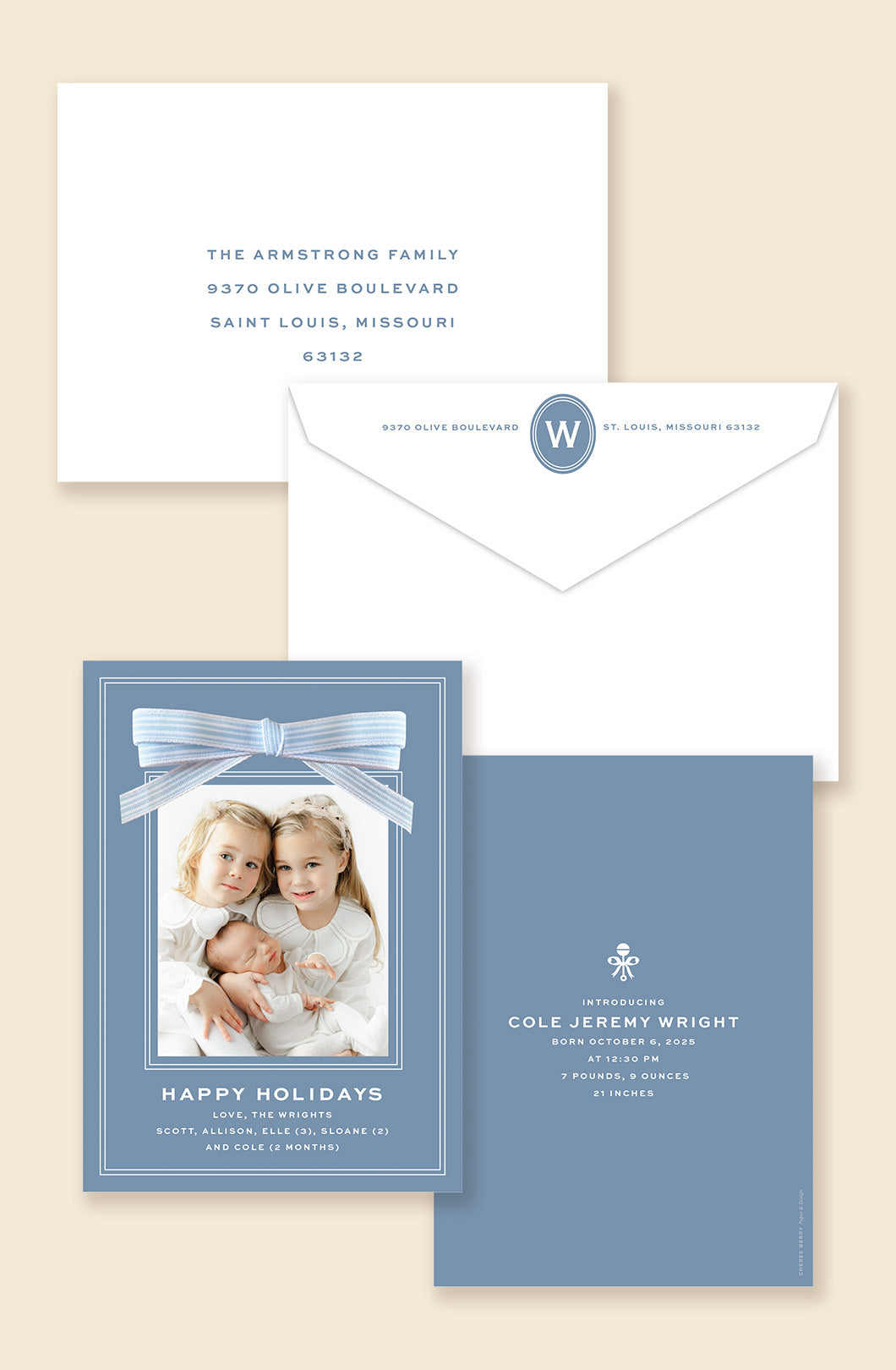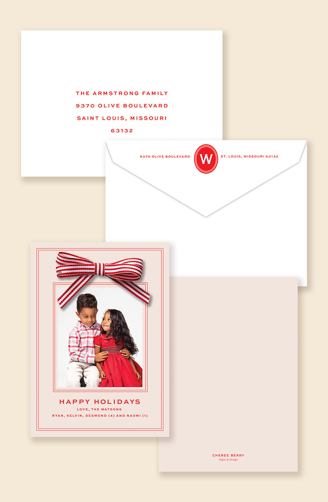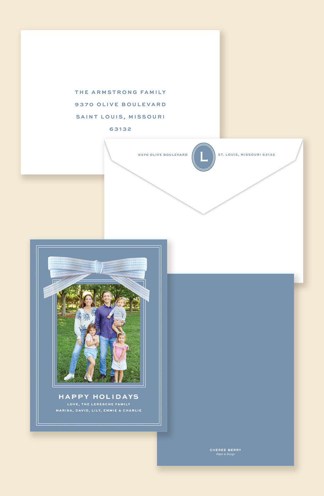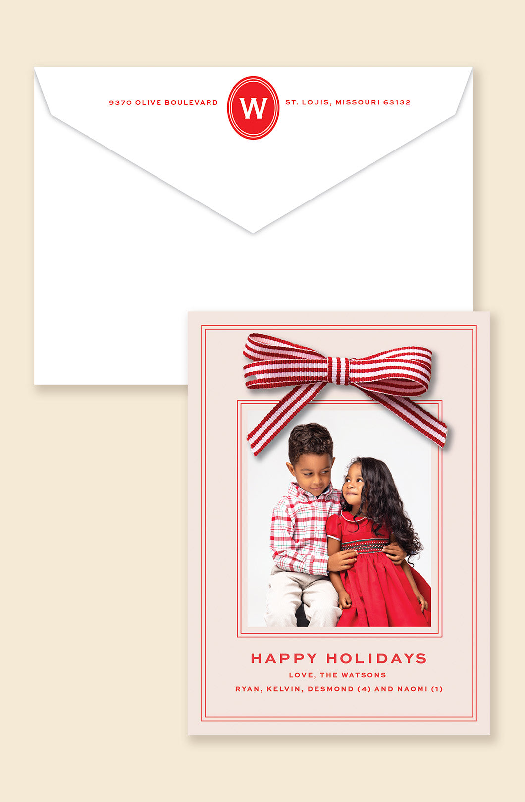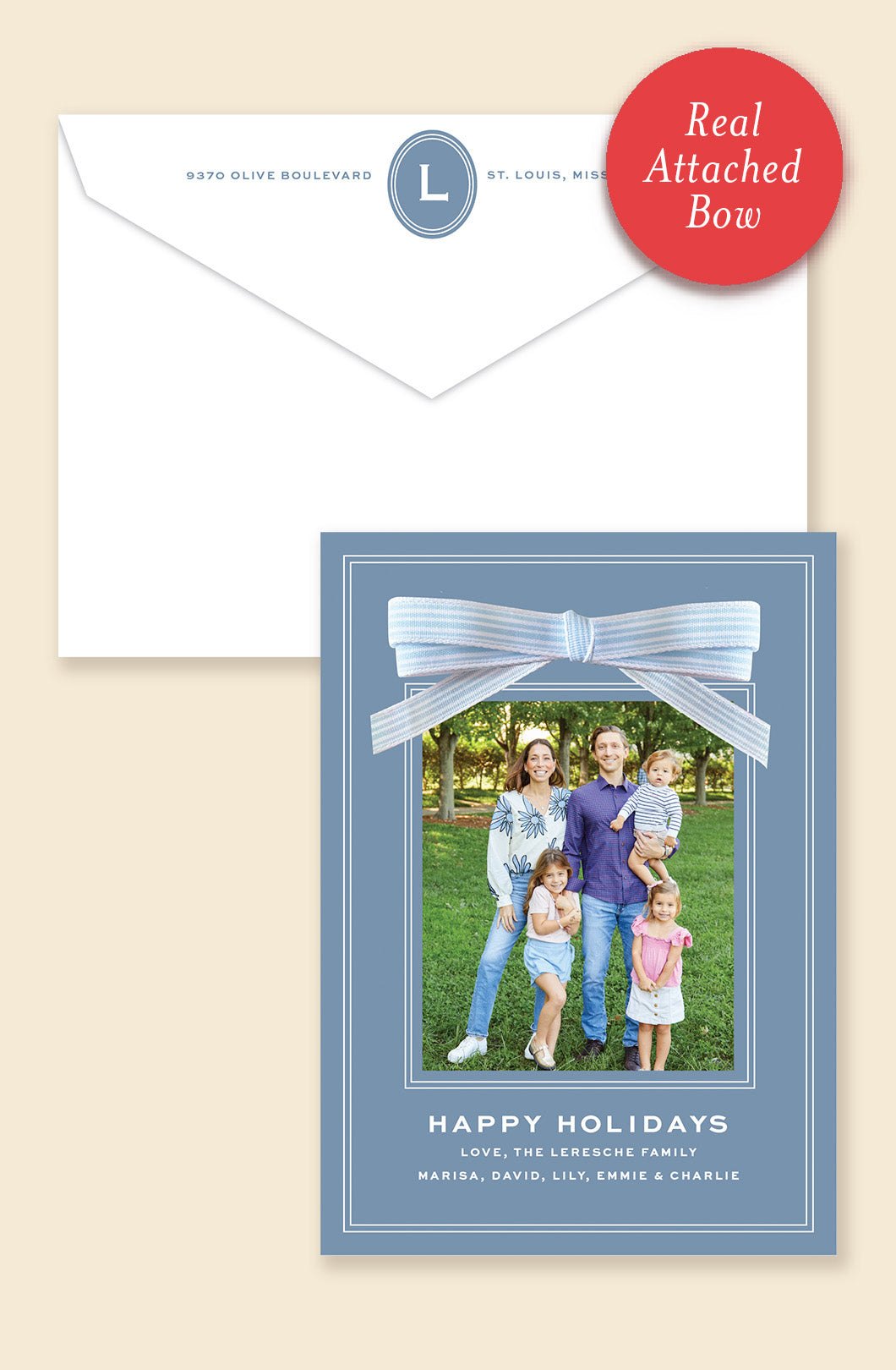 Dressed to impress! This design is a textural treat, featuring an attached photo framed by crisp lines and finished with a hand-tied bow. Crafted on luxe paper and paired with a perfectly matched envelope, it’s a holiday hello designed to be displayed.