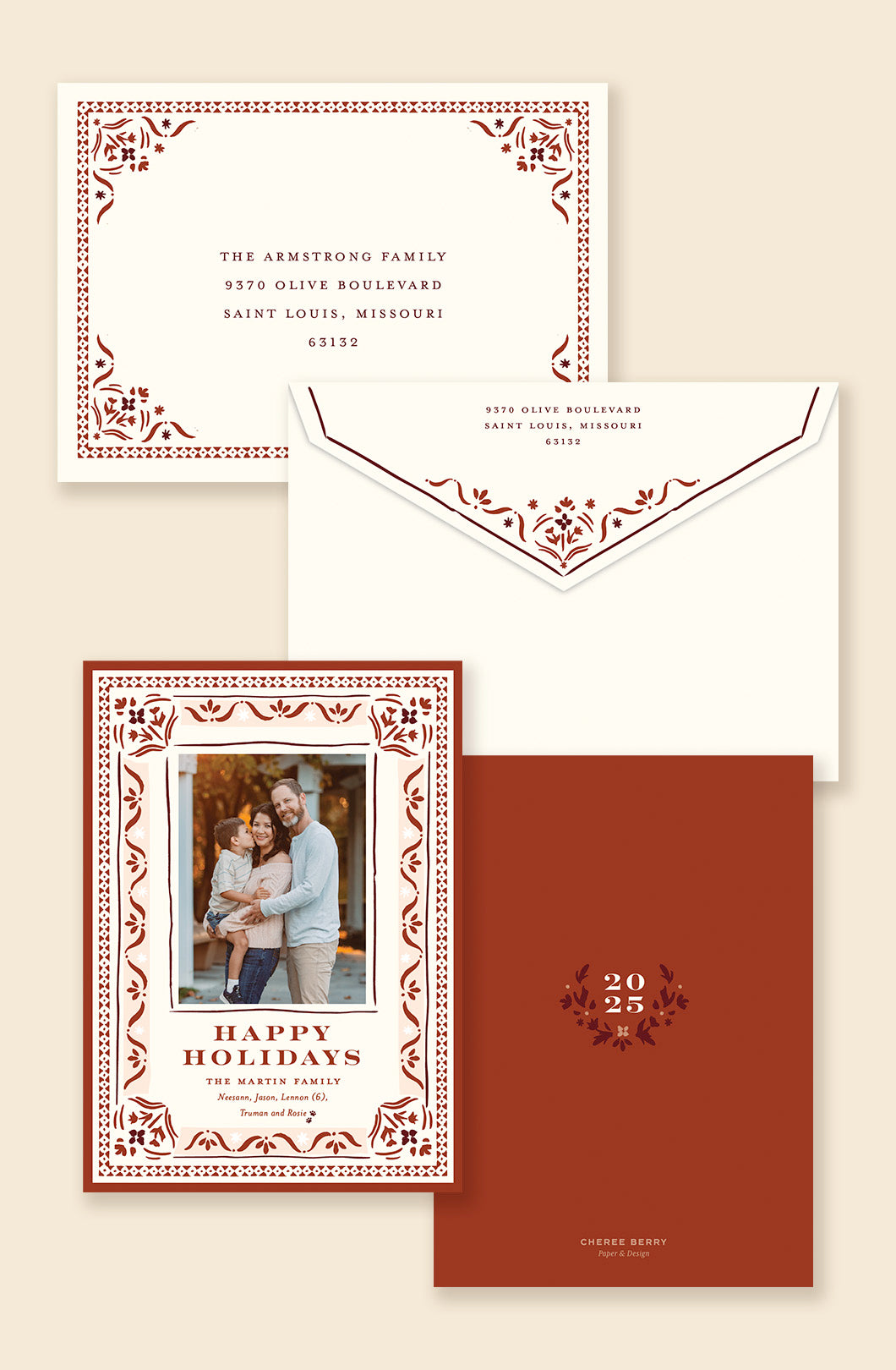 From the acclaimed creative minds of Cheree Berry Paper & Design comes a collection of luxury holiday cards designed to deliver joy, one envelope at a time. Whether you're sharing highlights of the year, announcing a new address, or simply sending seasonal cheer, these cards blend modern paper design with playful wit and standout detail. Every order includes a digital proof created by a real human designer, plus return and recipient address printing for a polished, stress-free send-off. With options like custom artwork, personalized messages and mounted photos, your holiday mail has never looked – or felt – so thoughtfully crafted.
