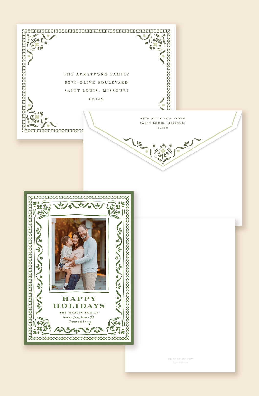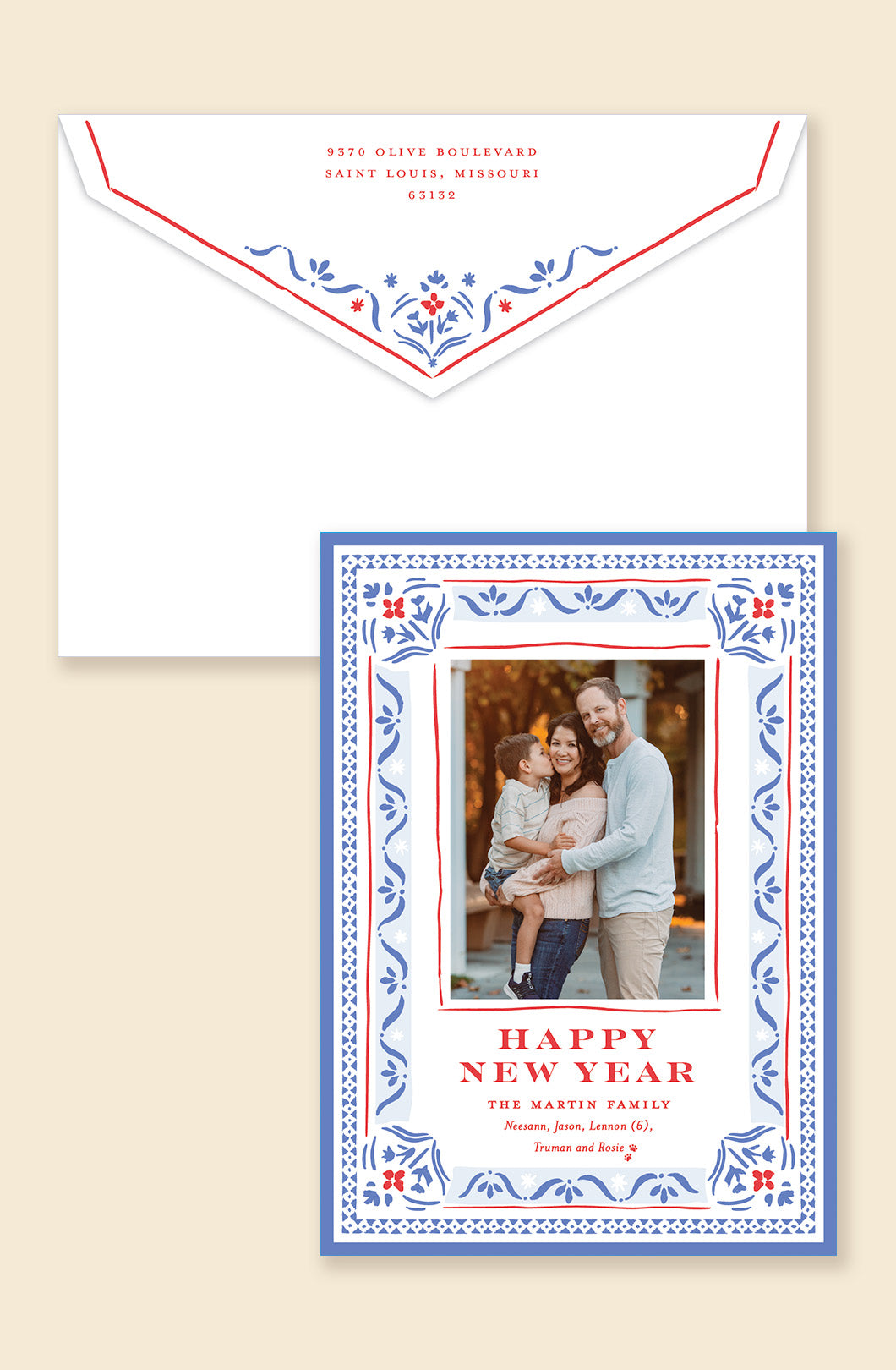 The prettiest print on the block! This bestselling design features a symmetrical floral border and classic photo placement on the front, with the option to include up to two additional photos on the back. Elegant envelope artwork completes the timeless look.