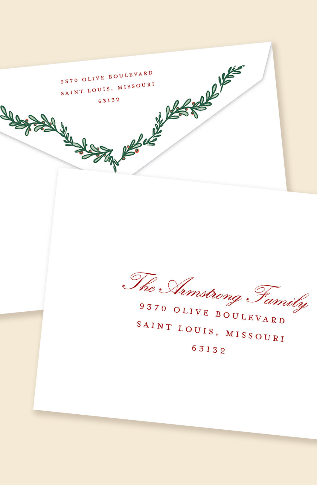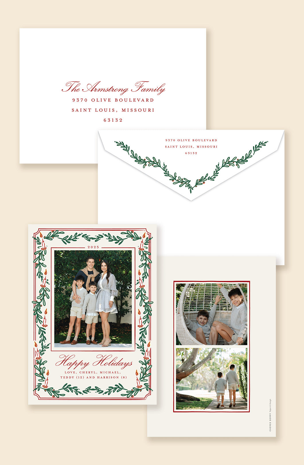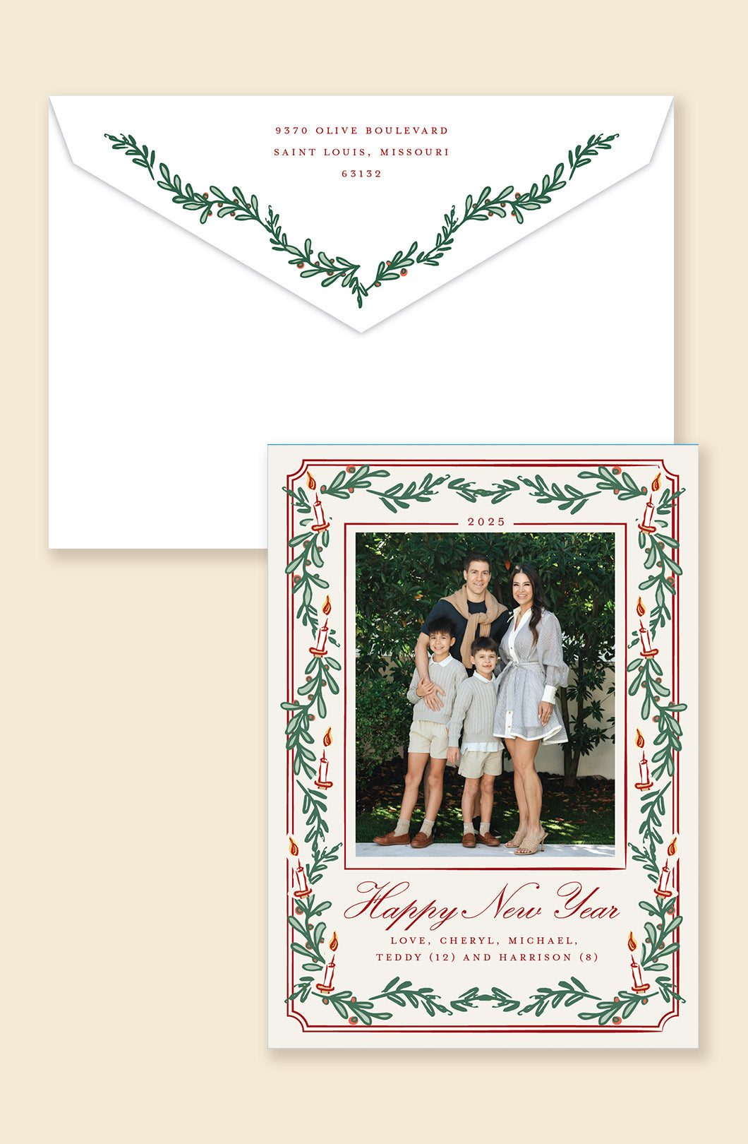 Wrapped in greenery, trimmed with charm, this holiday card features a candlelit greenery border surrounding your main family photo on the front, with space for up to three additional photo cutouts on the back. Matching envelope artwork completes the classic look with a polished seasonal touch.