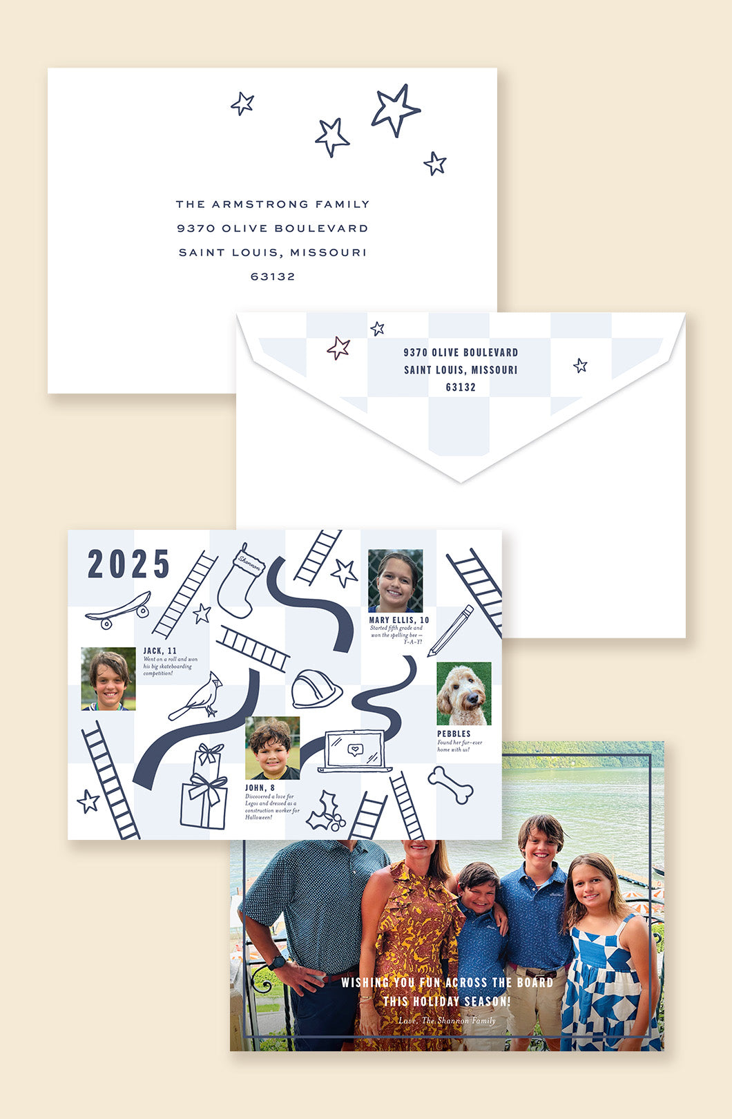 This card plays like a holiday highlight reel, complete with custom icons and personalized notes for each family member. From hobbies to milestones, it’s all laid out in a whimsical board game style and finished with a festive full-bleed back photo and coordinating envelope artwork