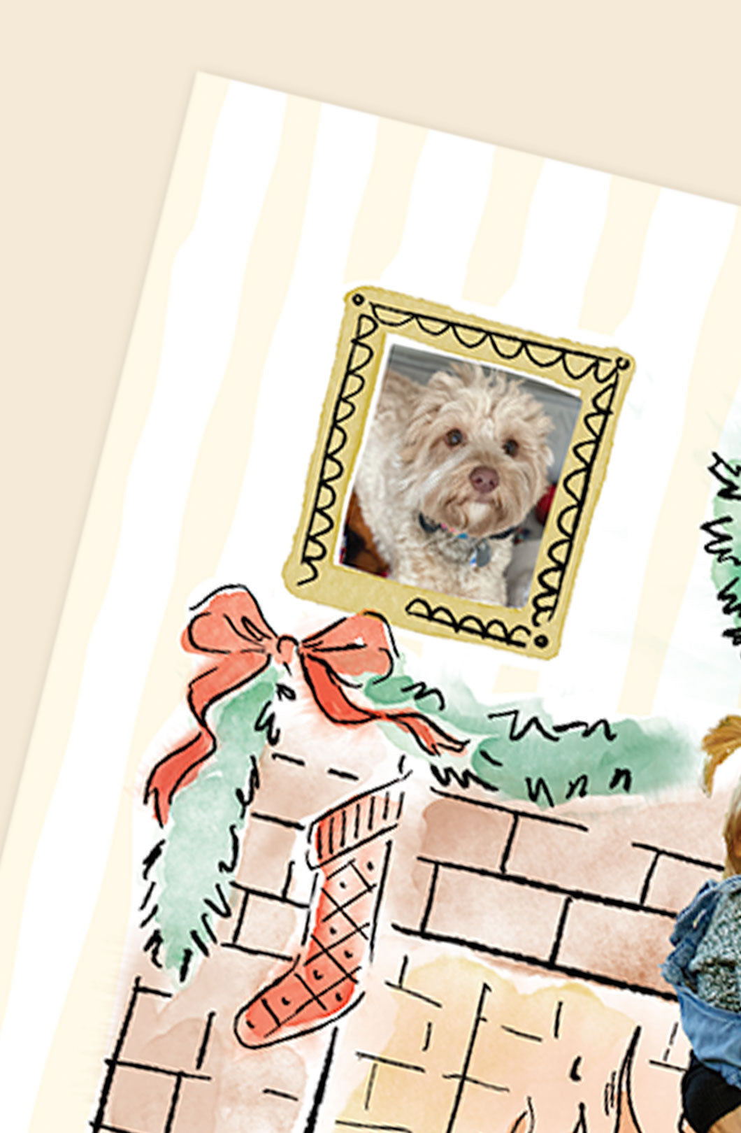 Deck the halls – and your loved ones' mailboxes! A die-cut tree and fireplace surround your cutout family photo on the front, while a secondary framed photo above the mantel provides the perfect place for your furry friend. The back provides space for one more photo and your family's signoff. Soft watercolor illustrations give an elevated, handcrafted feel. A memorable design that adds dimension and personality to your holiday mailing.