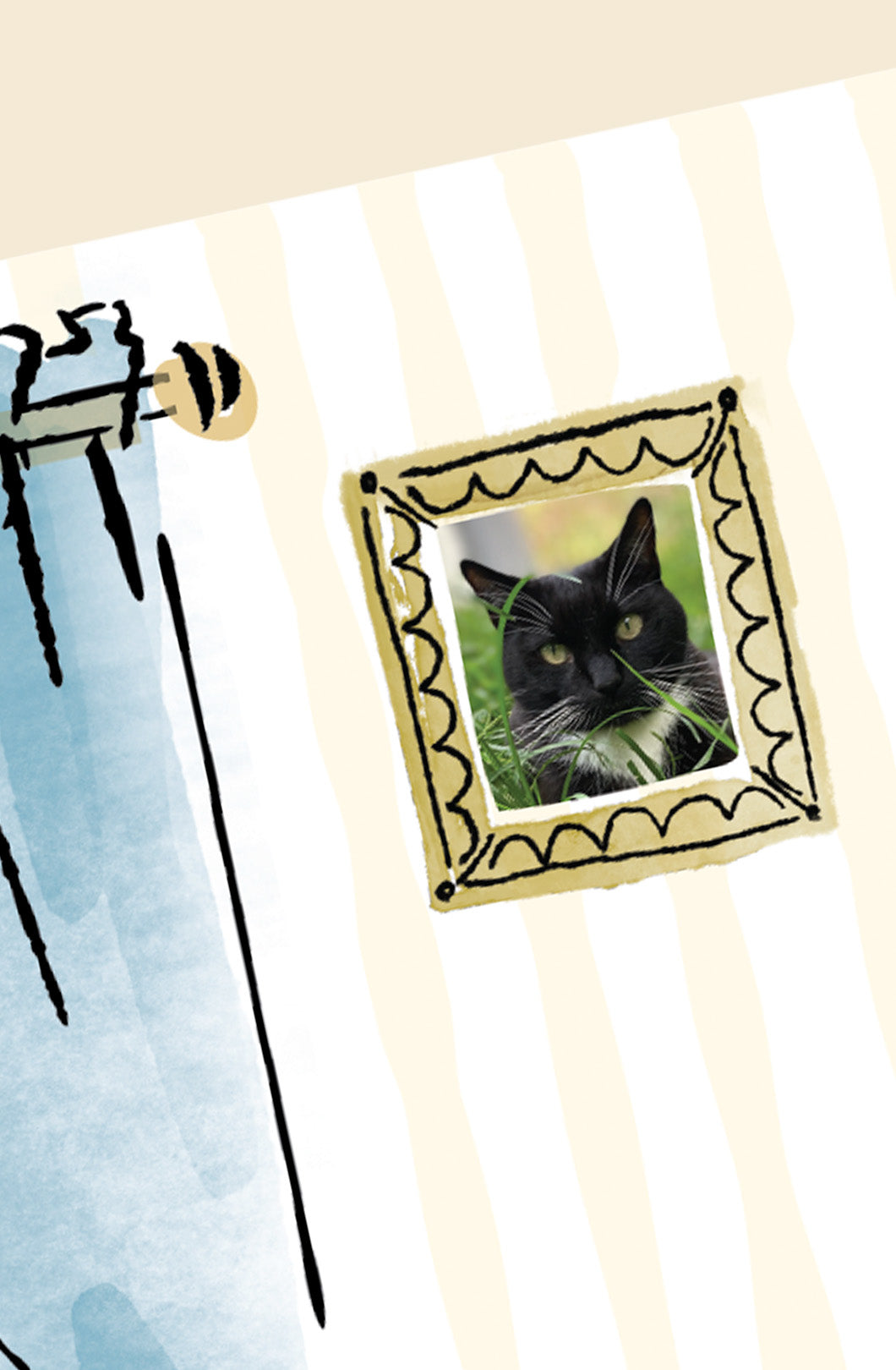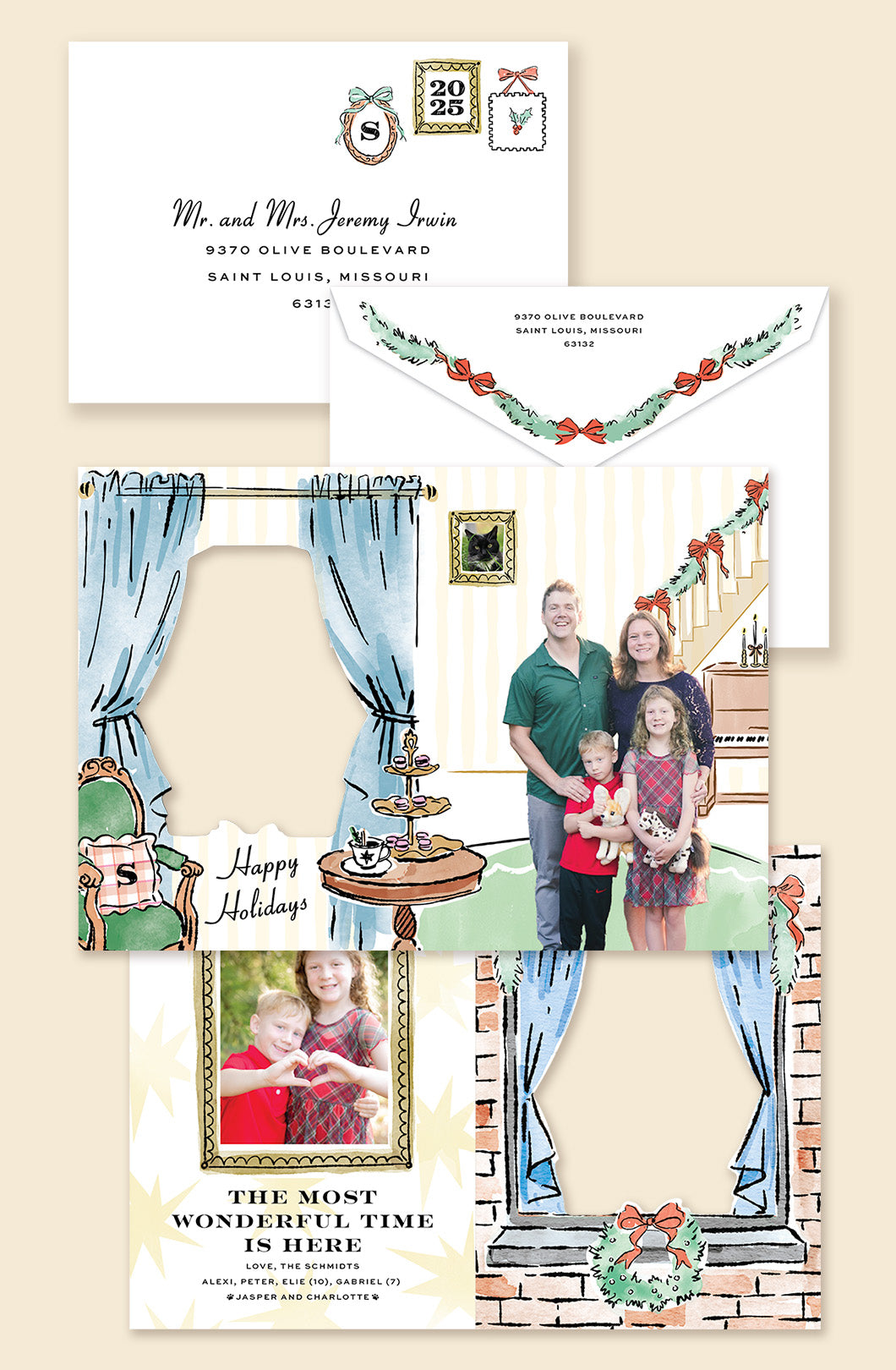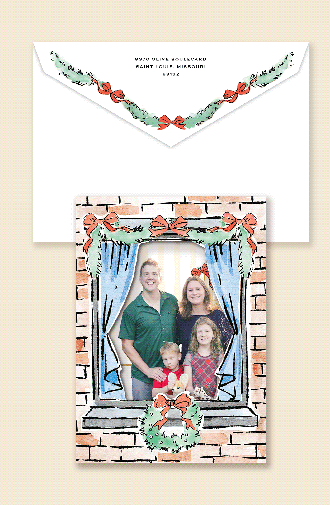 Step inside the party! This card is bursting with cozy home-for-the-holidays charm, complete with a watercolor-style living room illustration and die-cut curtains that frame your family photo just like a window to winter joy. Open it up to find even more personality – a playful tea-time setting, festive staircase, and sweet details all around, with a third frame on the back. A custom envelope decked out in garland and bows seals the scene.