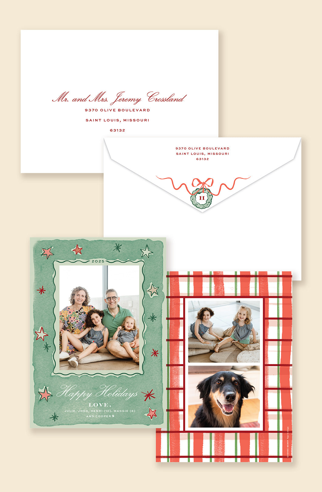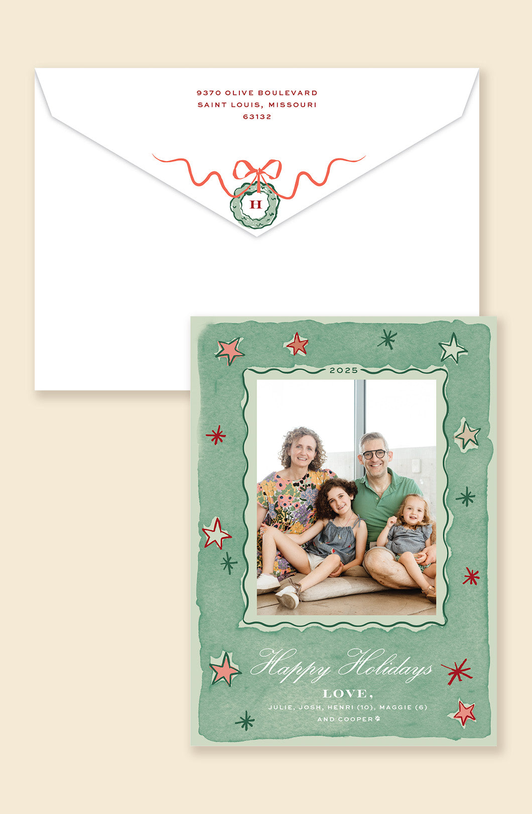 Holiday hues, hand-painted with love. This design pairs a bold plaid backer with a star-bordered front frame for a festive, photo-forward layout. With space for up to two more photos on the back, it’s a perfect pick for highlighting multiple moments in one joyful card. A coordinating envelope featuring a personalized wreath design complete the polished presentation.