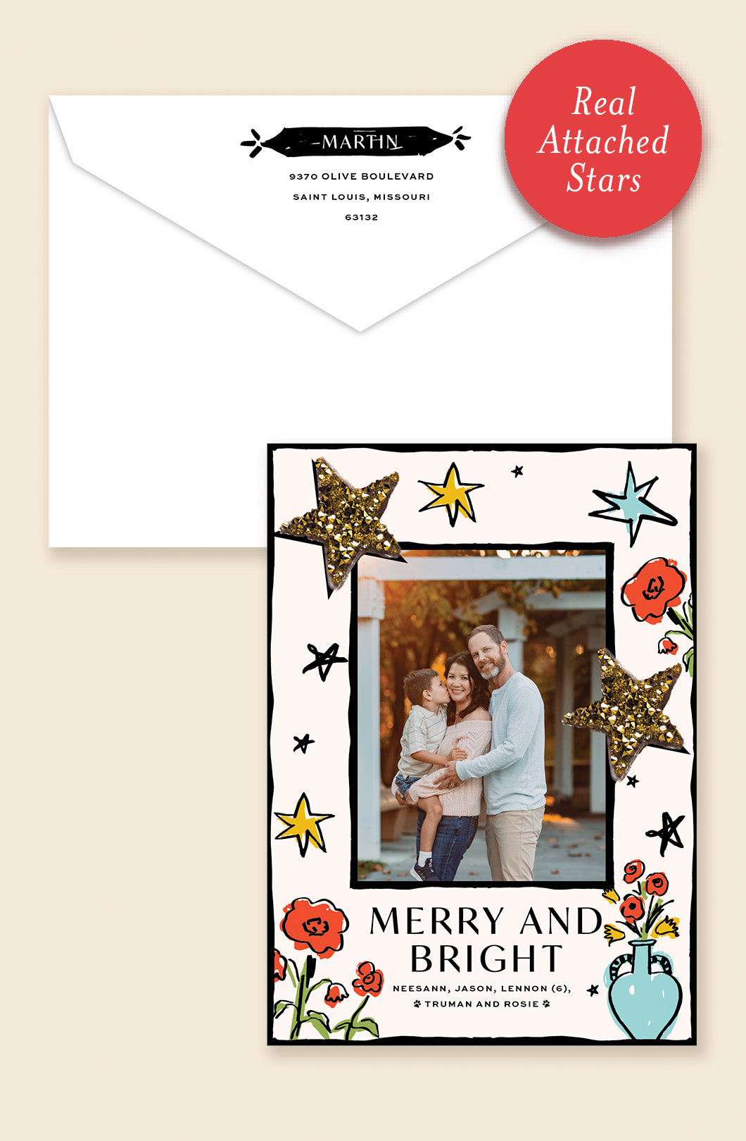 Shine on! With attached rhinestone stars and a charming illustrated frame, this card adds a dimensional sparkle to your holiday greeting. Hand-drawn florals and stars surround your favorite photo, while the back design offers space for additional images. Coordinating envelope artwork adds polish to this unique, standout design.