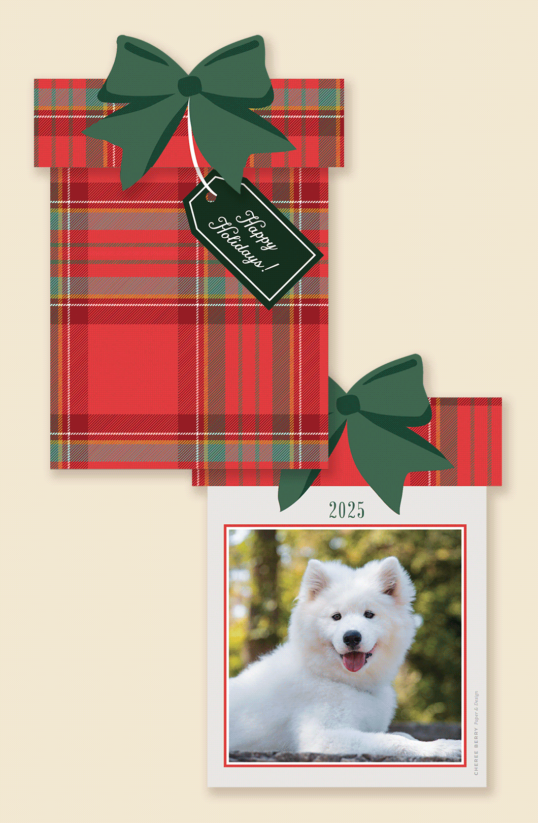 No one will ever want to regift these greetings – they’re the full, festive package! This multifold card’s signature details include a unique format die-cut in the shape of a gift box that unfolds to reveal your family photos, your preferred wrapping paper pattern and a faux gift tag on the front of the envelope.