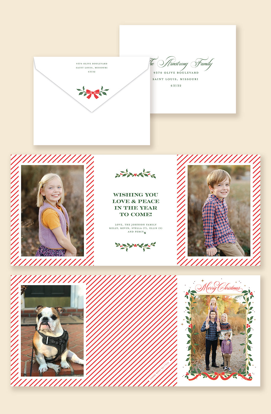 It’s time for mistletoe and holly! This multifold card’s signature details include a festive yet formal winterberry border wrapping around your family photo on the front, an additional three family photos on the interior embellished with small starbursts and sprigs, a pencil stripe pattern across the exterior and coordinating artwork on the envelope.